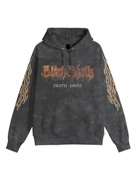 • Design Elements: Bold skull graphic on the front, flame patterns on sleeves, spine design on the back