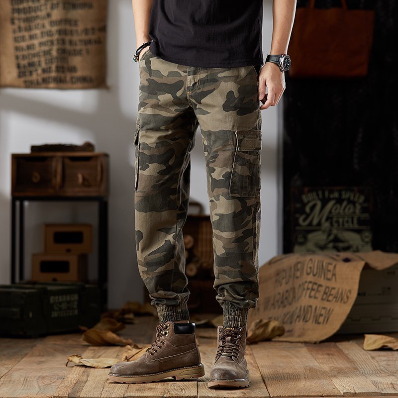 • Design Elements: Multi-pocket design, camouflage pattern, adjustable waistband