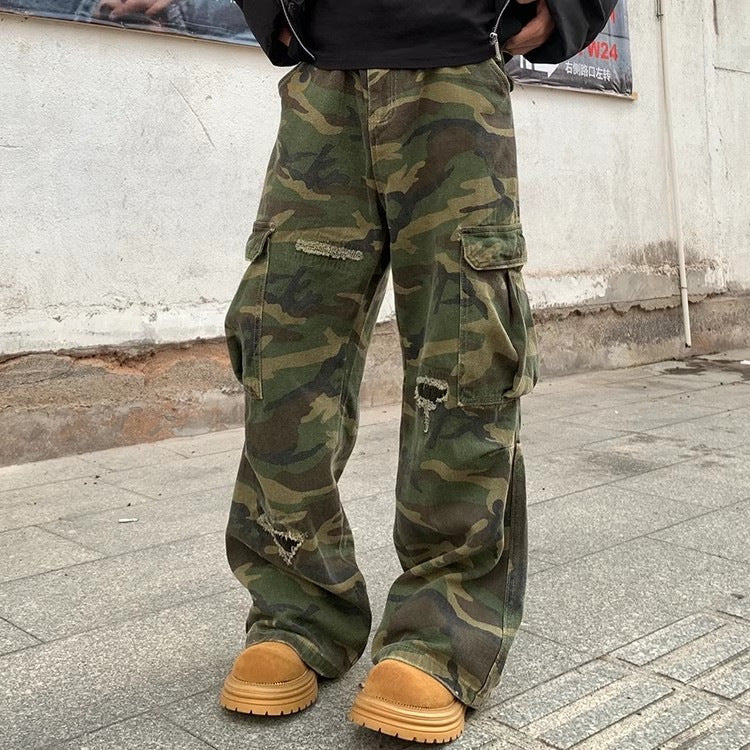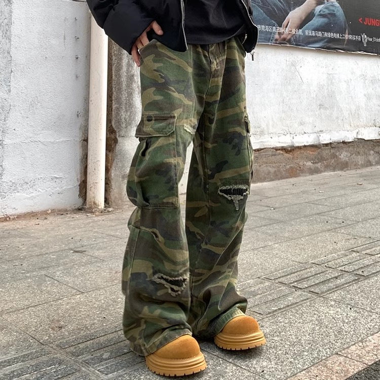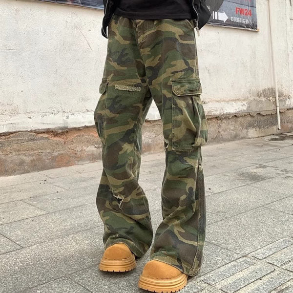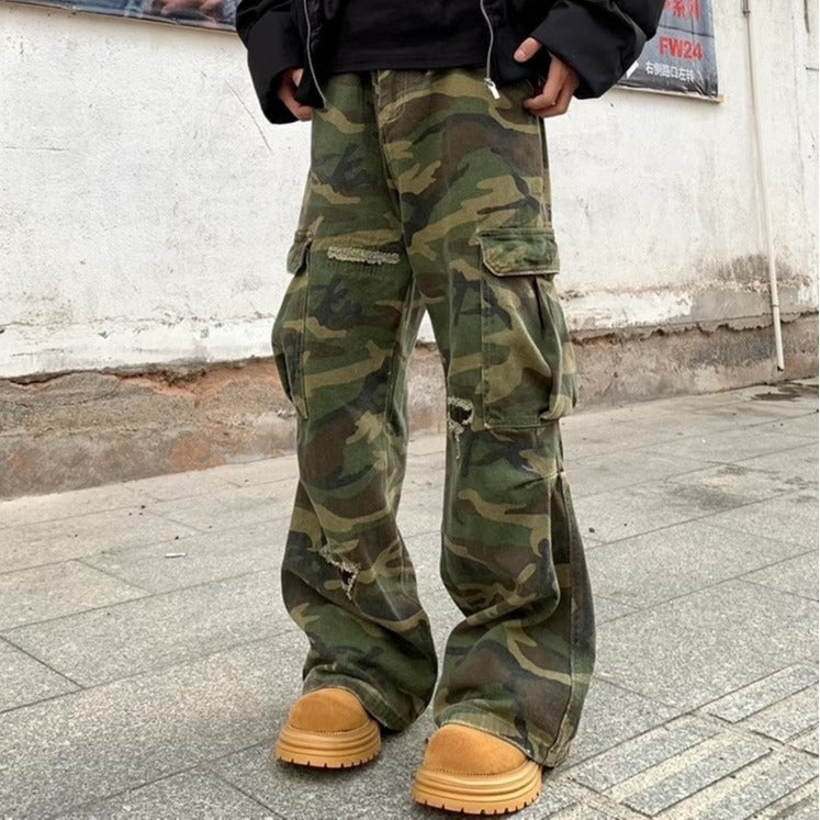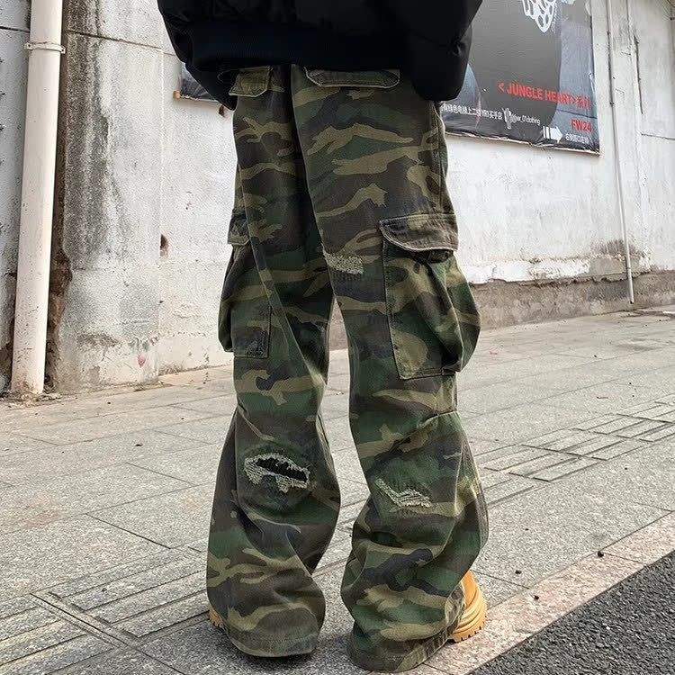 • Design Elements: Multi-pocket design, camouflage pattern, distressed details