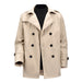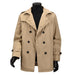 • Design Elements: Double-breasted closure with large buttons, notched lapel collar, adjustable cuffs