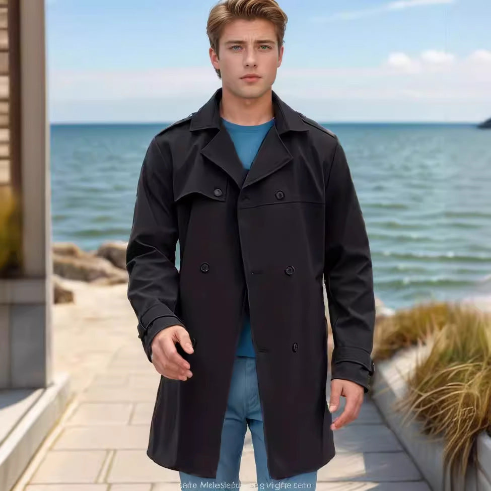 • Design Elements: Double-breasted front closure, wide lapel collar, adjustable cuffs