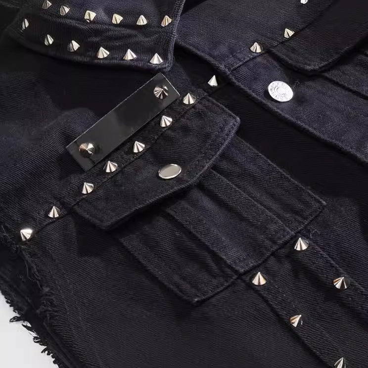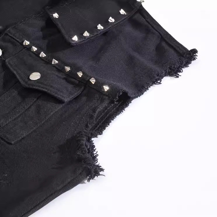 • Design Elements: Rivet embellishments, button closures, frayed edges
