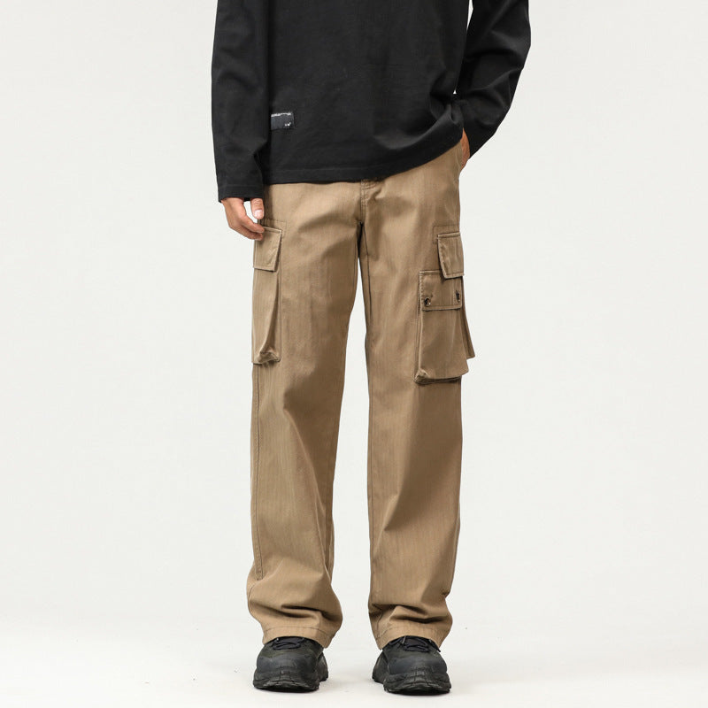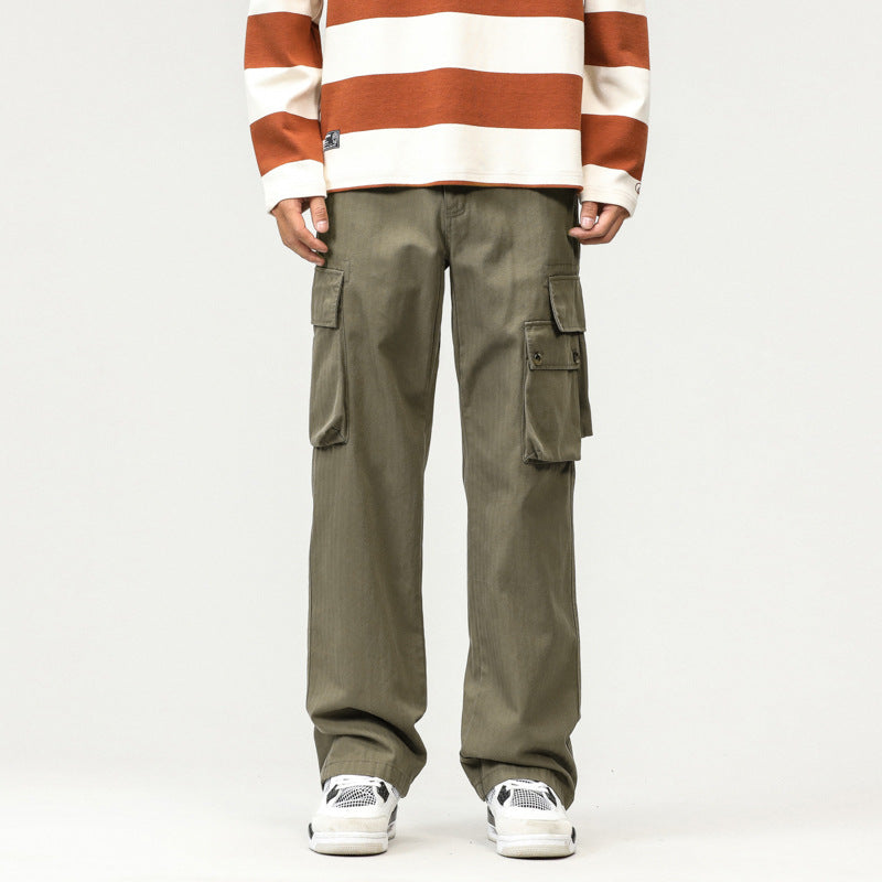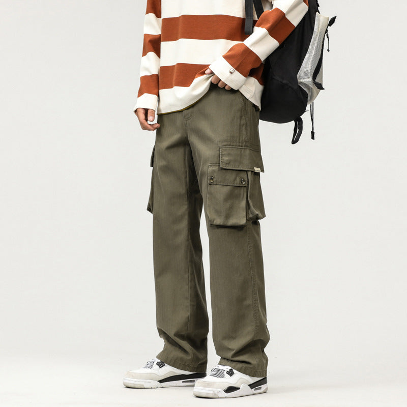 • Design Elements: Large side pockets, relaxed fit, striped sweater pairing