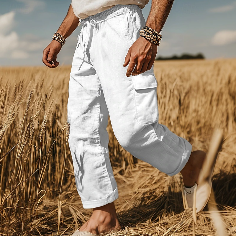 Cotton Linen Blend Fabric : Crafted from a blend of cotton and linen, these pants offer excellent breathability, durability, and a soft, comfortable feel against the skin.