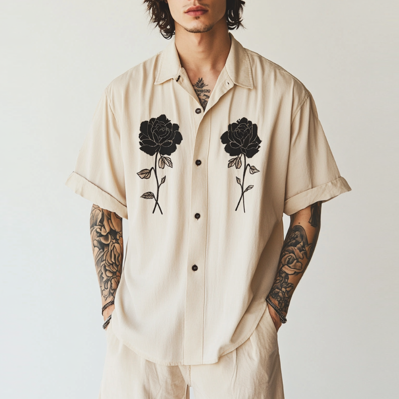 Stylish Rose Embroidery : The unique rose embroidery on the lapel adds a touch of sophistication and artistic flair, setting this shirt apart from typical casual styles.