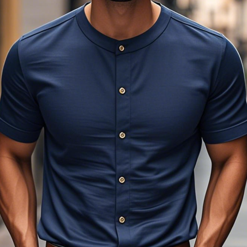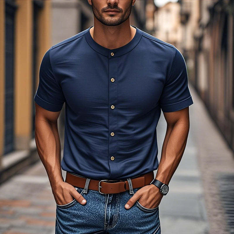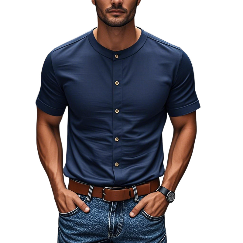 The Men's Casual Cotton Round Neck Single Breasted Slim Fit Short Sleeve Shirt offers a perfect combination of comfort, versatility, and modern style. Made from soft cotton, this shirt is designed for a casual yet polished look, making it an ideal choice for a variety of occasions. Its slim fit cut ensures a flattering silhouette, while the round neck and single-breasted button design provide a clean, contemporary style.