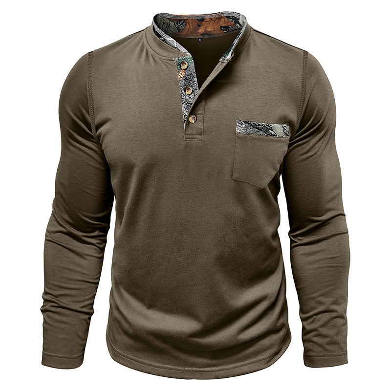 • Design Elements: Camouflage accents on the collar and pocket flap, buttoned placket, chest pocket