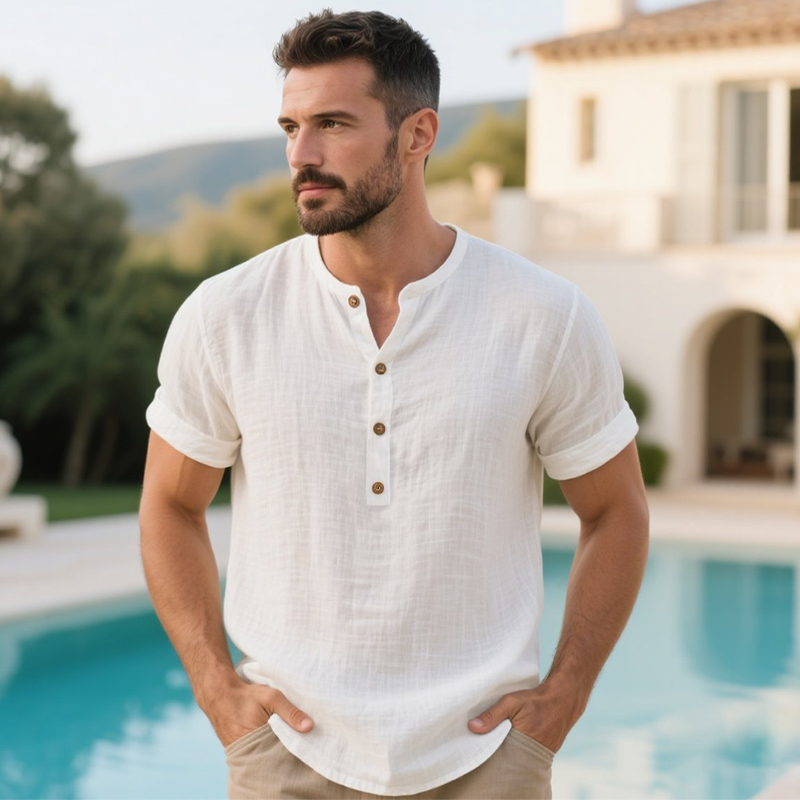 • Design Elements: Buttoned placket, relaxed fit, rolled-up sleeves