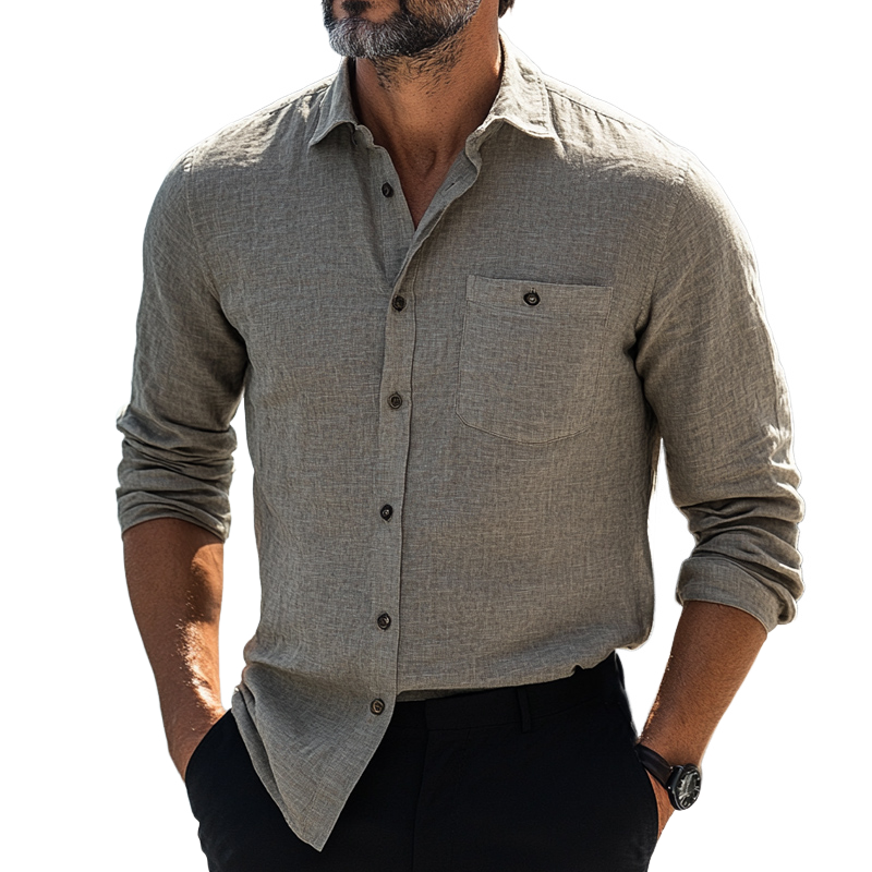The Men's Casual Skin-friendly Gray Cotton and Linen Long-Sleeved Shirt is perfect for those seeking a balance of comfort, breathability, and timeless style. With its soft fabric, classic design, and versatile color , this shirt is a staple for any man's wardrobe.