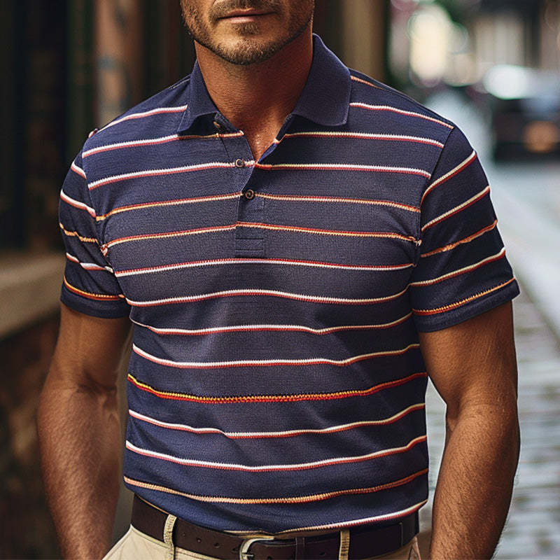 Elevate your casual style with our Men's Casual Striped Print Short-sleeved Breathable Polo Shirt. This classic polo features a stylish stripe design in vibrant colors against a rich navy background, making it a versatile choice for any occasion. Crafted from breathable fabric, this shirt offers exceptional comfort while maintaining a polished look that is perfect for both casual outings and social events.