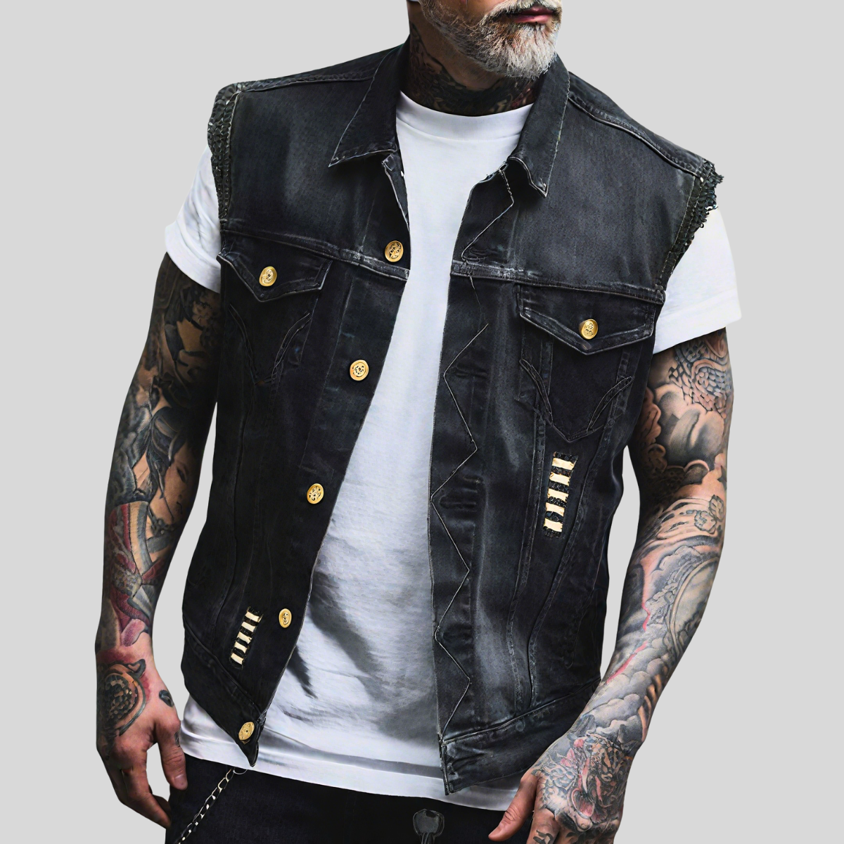 Inspired by our vintage leather vest collection, our designers have reimagined this classic piece in denim. Using advanced washing and distressing techniques, we've achieved a natural texture and unique style. The classic black color and silver buttons give it a fashion-forward and high-quality appearance.