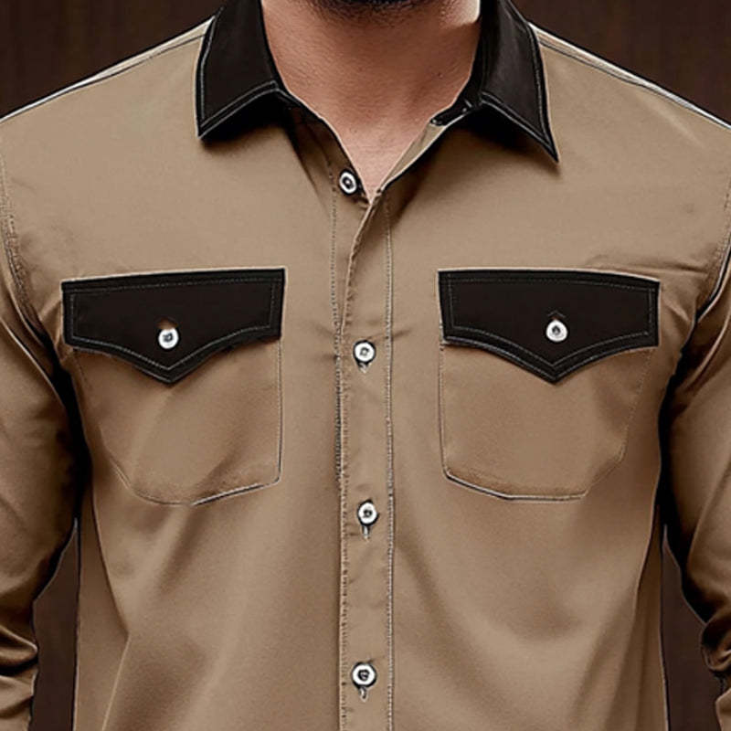 Men's Comfortable Khaki Colorblock Casual Long Sleeve Shirt