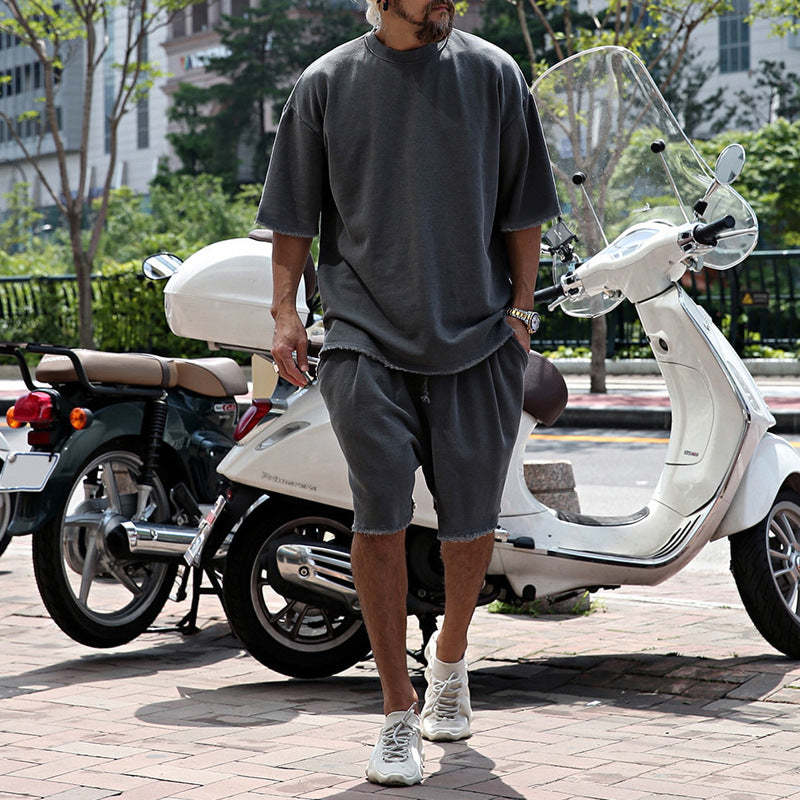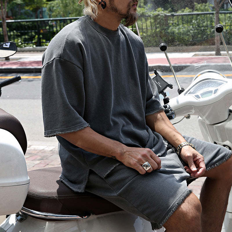 Men's fashion loose short t-shirt and shorts set belong to men with a sense of functionality, luxury and comfort. They are finished with distressed edge on the bottom hem and cuffs for a sophisticated look. Loose version gives you a casual and flattering look. Choosing the garment you like is not only a kind of attitude towards life, but also a kind of care for yourself.