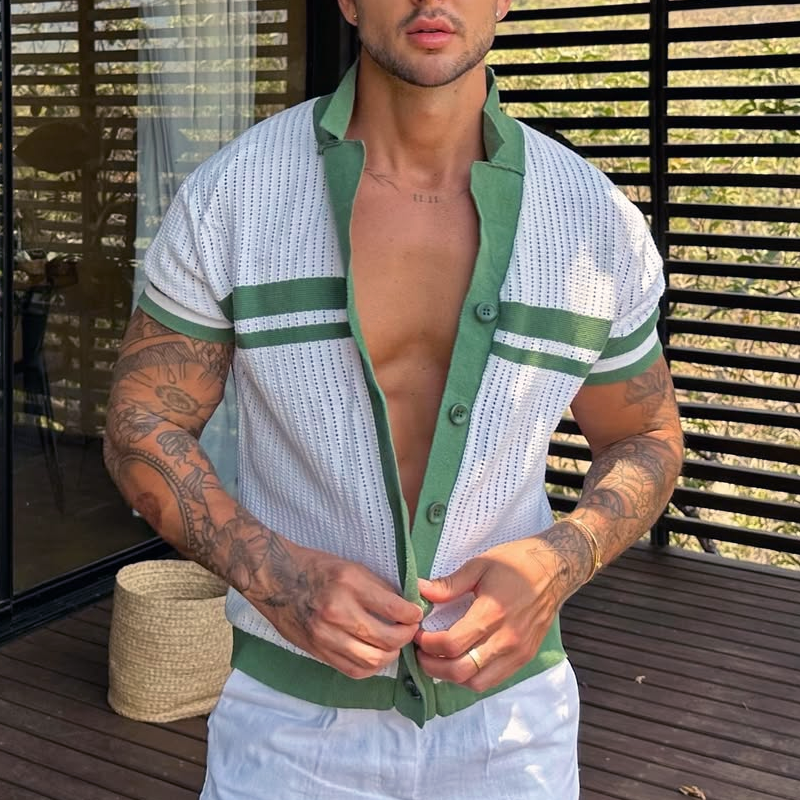 The Men's Knit Striped Notch Lapel Single Breasted Short Sleeve Polo Shirt is an essential addition to your collection. Enjoy the perfect blend of comfort, style, and versatility with this fashionable polo that will keep you looking sharp in any setting!