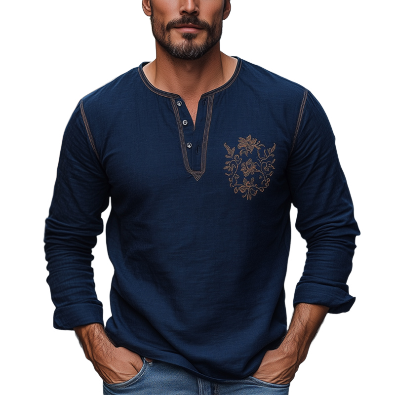 Product Name: Men's Navy Blue Cotton and Linen Embroidered Henley Collar Long Sleeve T-Shirt