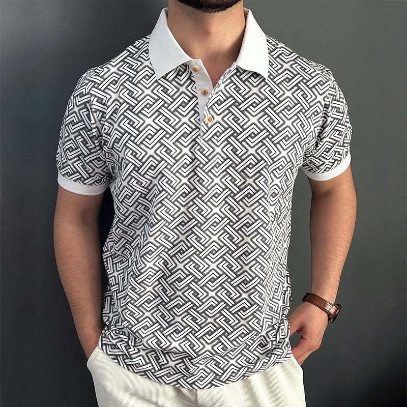 Description: Introducing our Men's Retro Casual Geometric Print Lapel Short Sleeve Polo Shirt, a stylish addition to your wardrobe that embodies timeless fashion with a modern twist. Perfect for casual outings, this polo shirt combines comfort and chic design, making it an ideal choice for any casual occasion.