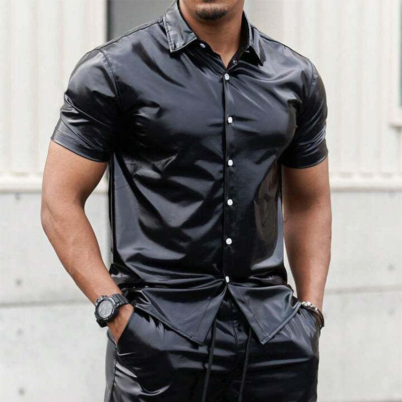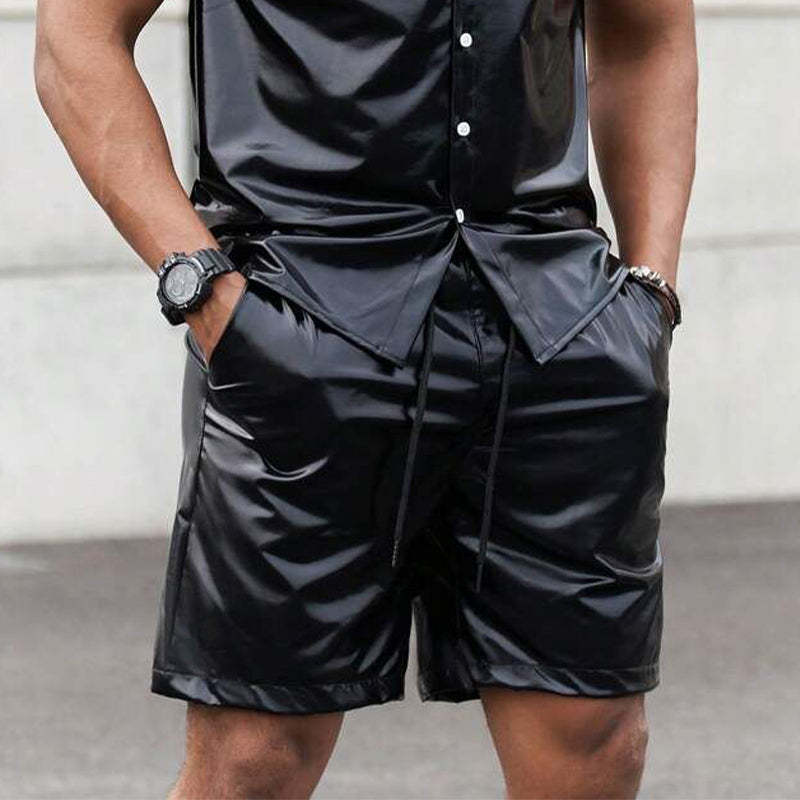 Introduce a touch of boldness and modern edge to your wardrobe with our Men's Shiny PU Leather Plain Black Short Sleeve Set. This striking ensemble delivers an eye-catching style statement perfect for the fashion-forward individual. The set features a plain black short sleeve shirt paired with matching shorts, both crafted from shiny PU leather that offers a sleek and polished look. Ideal for making an impression at evening events or upscale casual gatherings, this set combines contemporary fashion with a hint of daring sophistication. Whether you're stepping out for a night on the town or attending a special occasion, this PU leather set ensures you stand out with confidence.