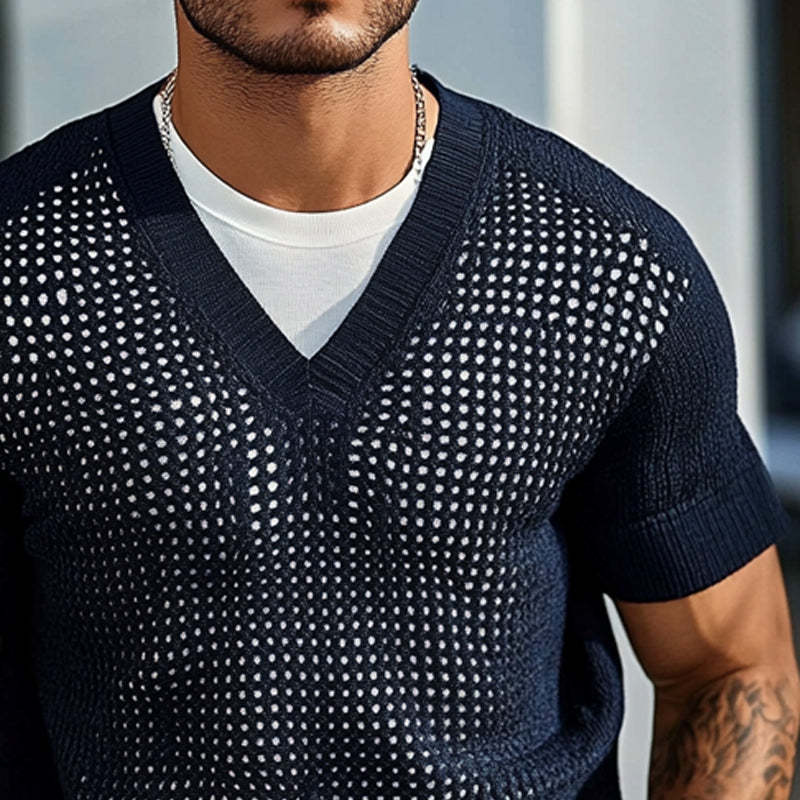 The Men's Solid Color Knitted V-Neck Short Sleeve Sweater T-Shirt is a versatile staple that effortlessly blends comfort with style. Its classic design ensures you'll reach for this sweater time and again, whether dressing up or down.