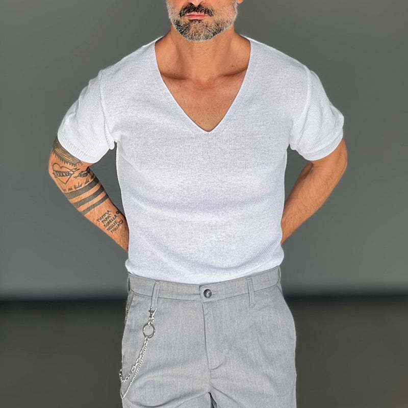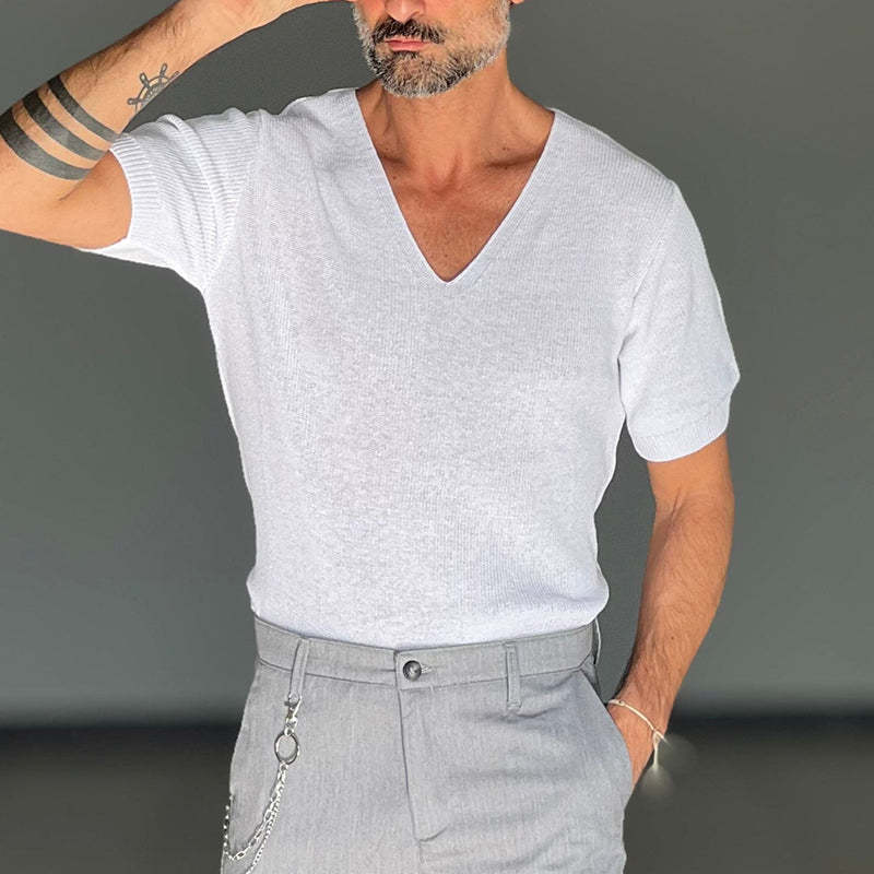 Product Name: Men's Solid Color V-Neck Short Sleeve Knitted T-Shirt