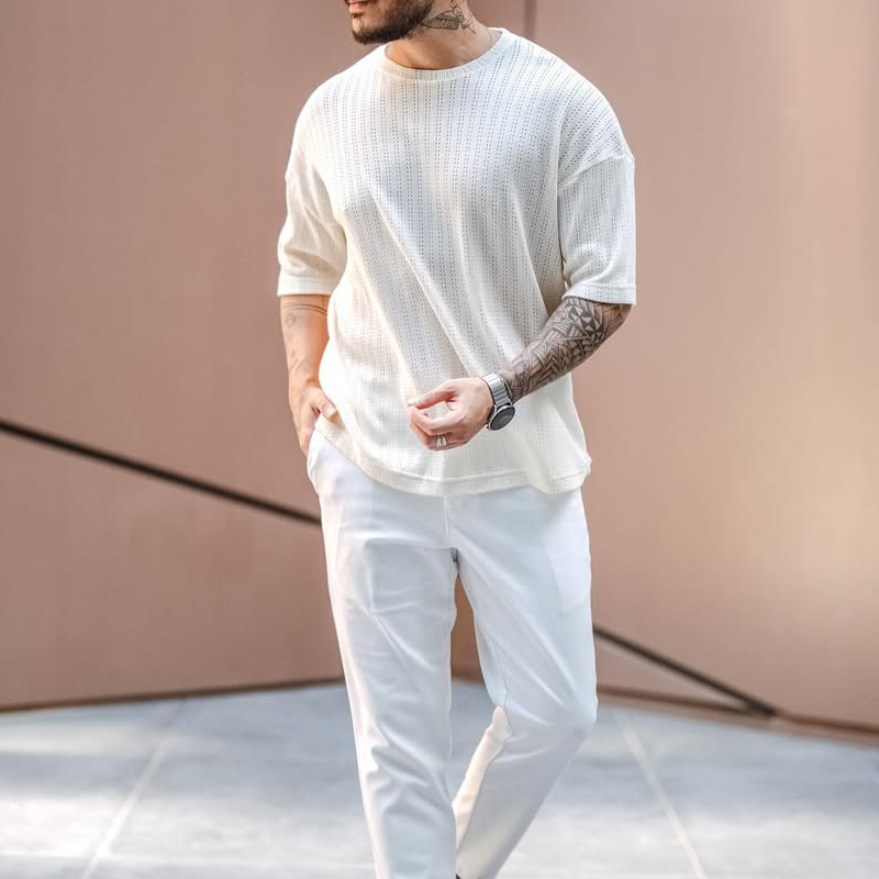 Enhance your casual wardrobe with our Men's Solid Hollow Out Round Neck Short Sleeve T-shirt. This trendy t-shirt features a unique hollow-out design that adds a modern twist to a classic silhouette, making it a great choice for those looking to stand out. Crafted from soft, breathable fabric, it ensures maximum comfort and a relaxed fit for everyday wear. The round neck and short sleeves provide a casual and easy-going vibe, perfect for layering or wearing on its own. Whether you're heading to a casual outing, lounging at Home, or working out, this versatile t-shirt pairs easily with shorts, jeans, or joggers.
