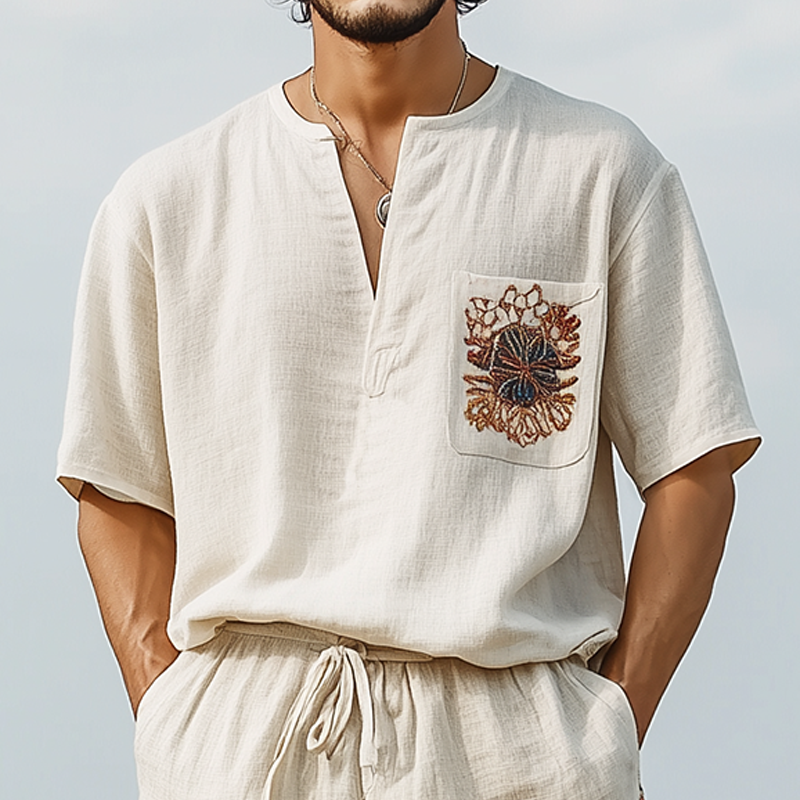 Discover the perfect combination of style and comfort with the Men's Spring and Summer Casual V-Neck Cotton and Linen Embroidered Short-Sleeved T-Shirt. Designed for warm weather, this shirt offers a relaxed fit and a trendy aesthetic, making it an essential addition to your summer wardrobe. Whether you're enjoying a casual day out or relaxing at home, this t-shirt will keep you looking effortlessly stylish.