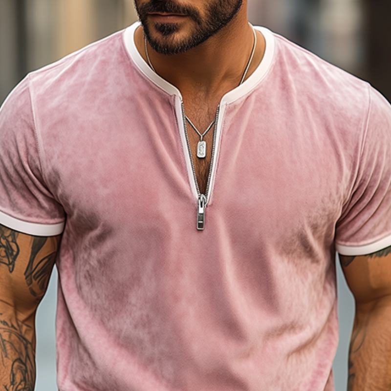 Introducing the Men's Spring and Summer Fashion Slim V-neck Zipper Suede Short-Sleeved T-Shirt, a chic and contemporary piece designed to elevate your warm-weather wardrobe. This t-shirt combines trendy design elements with the luxurious feel of suede to create a versatile option for various occasions. Perfect for casual outings or summer parties, this shirt makes a bold fashion statement while ensuring comfort.