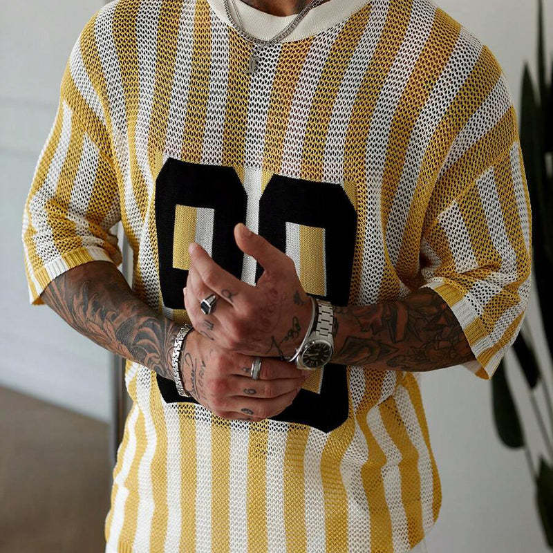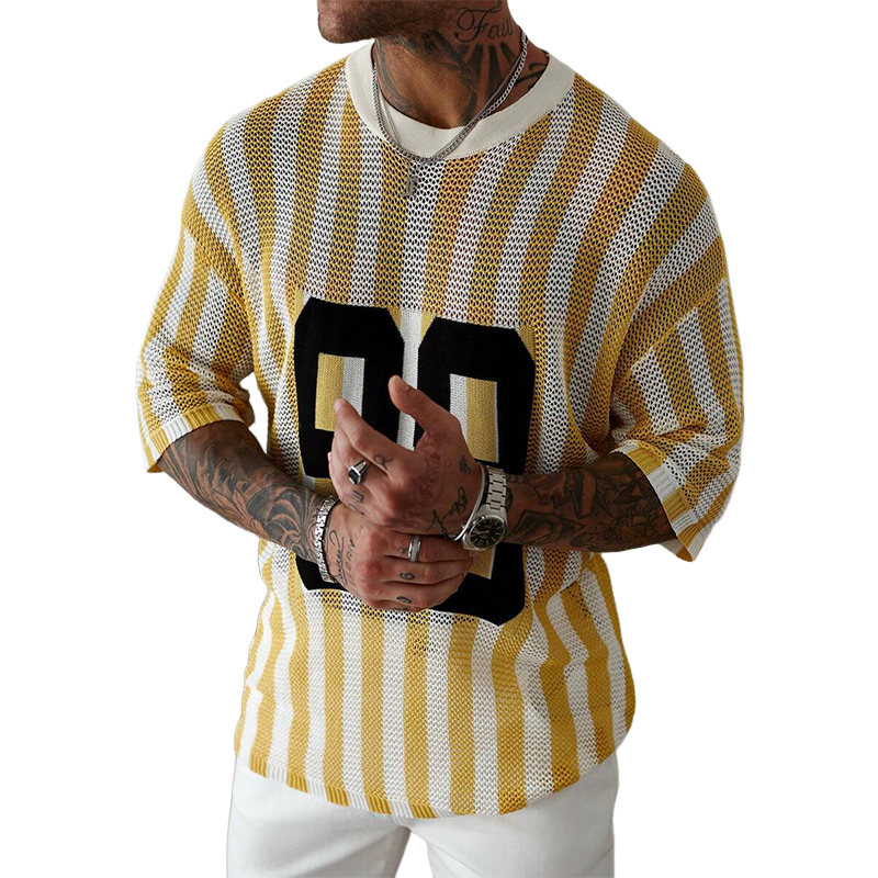 The Men's Striped Monogram Jacquard Short-Sleeved Knitted T-Shirt is a versatile addition to your wardrobe, offering style and comfort. Its premium quality and unique design make it an ideal choice for those looking to make an impression. Enjoy the perfect blend of fashion-forward aesthetics and everyday practicality with this standout T-shirt.