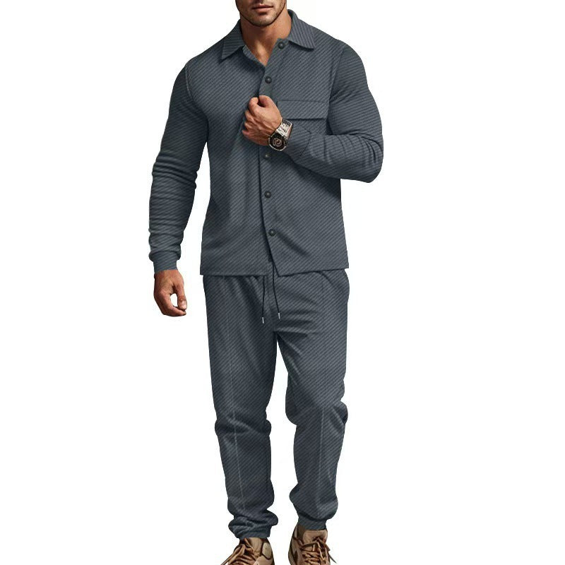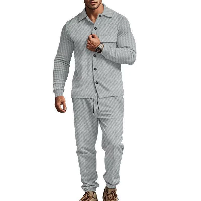 • Design Elements: Features a sleek button-down shirt paired with matching pants, creating a cohesive look