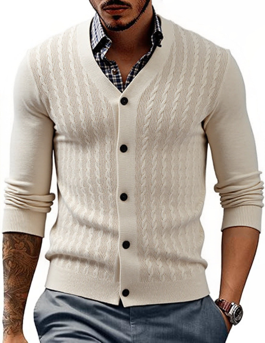• Design Elements: V-neckline, Button Closure, Cable Knit Pattern