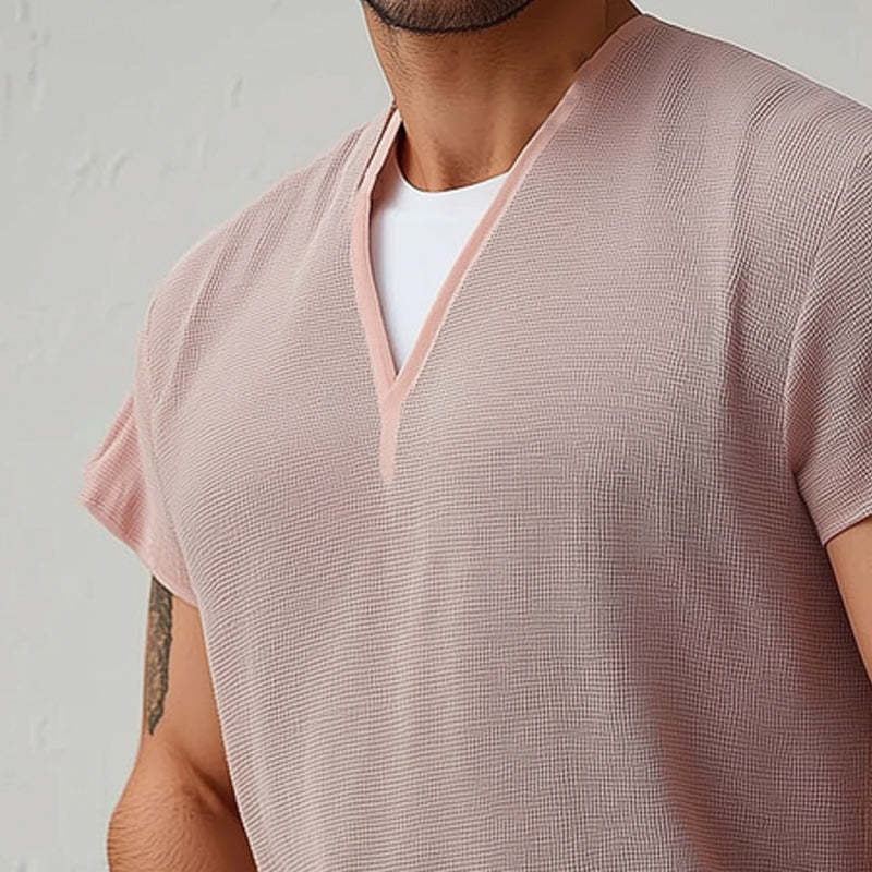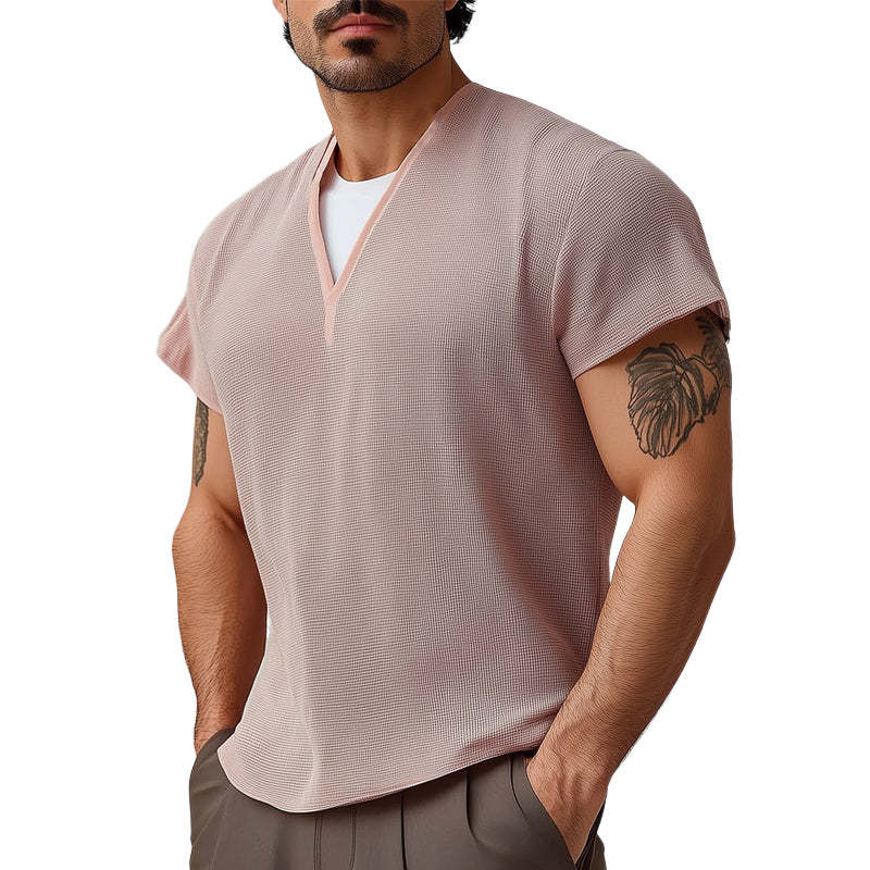 This Men's Summer Basic V-neck Textured Short-sleeved T-shirt is designed for comfort and style. Its refined details and versatile design make it an essential piece for any fashion-forward wardrobe. Embrace the trend and elevate your everyday look with this wardrobe staple.