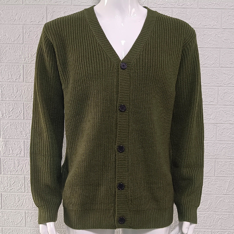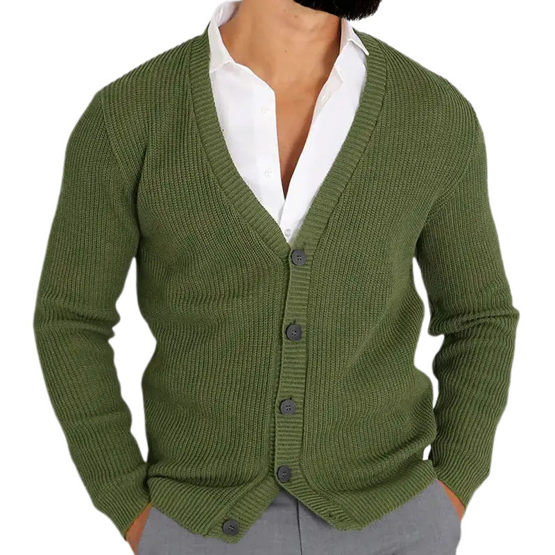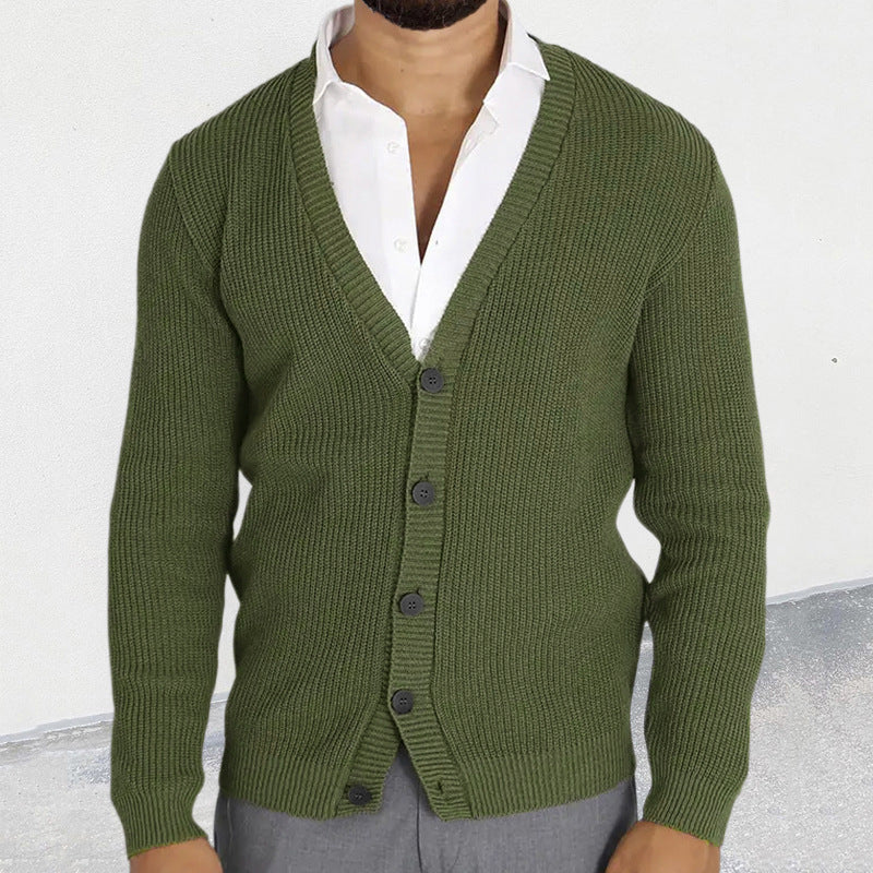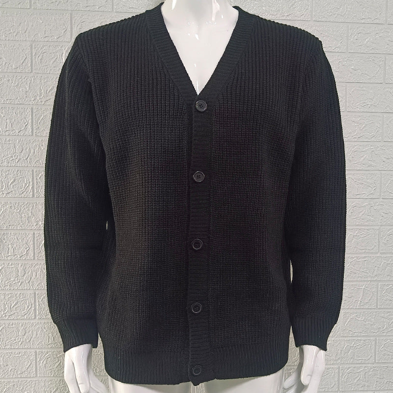 • Design Elements: Classic V-neck design, ribbed texture, button closure