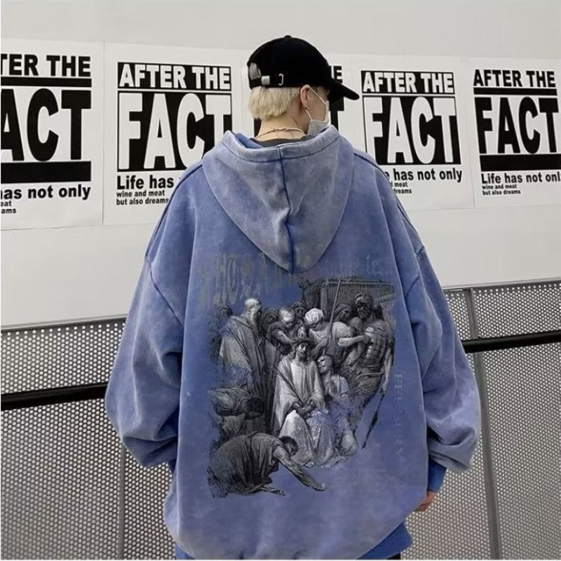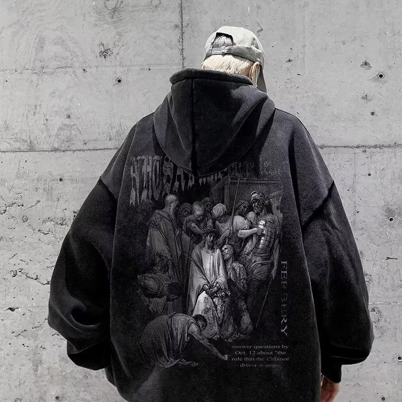 • Design Elements: Detailed graphic print on the back, hooded design, relaxed fit