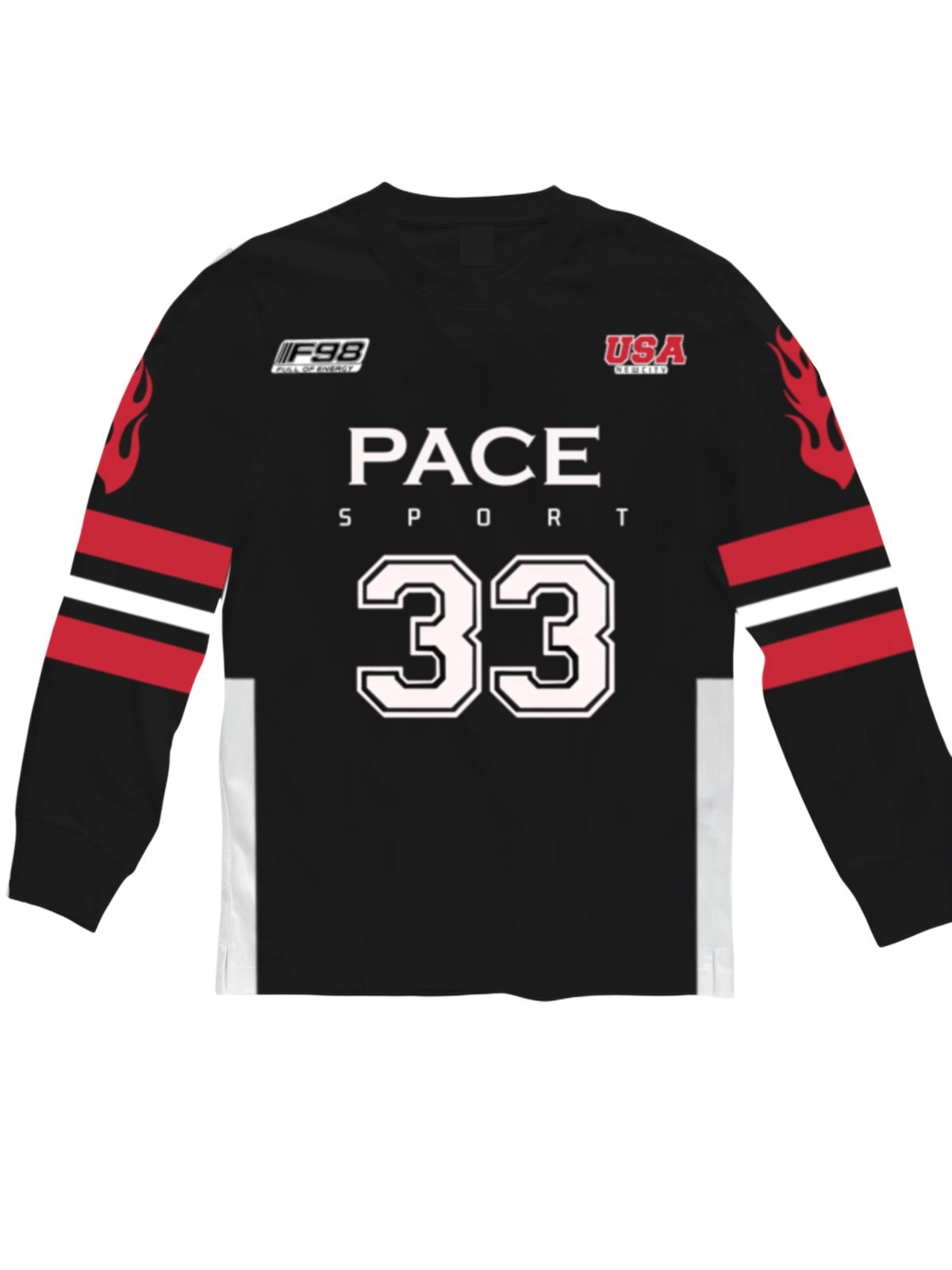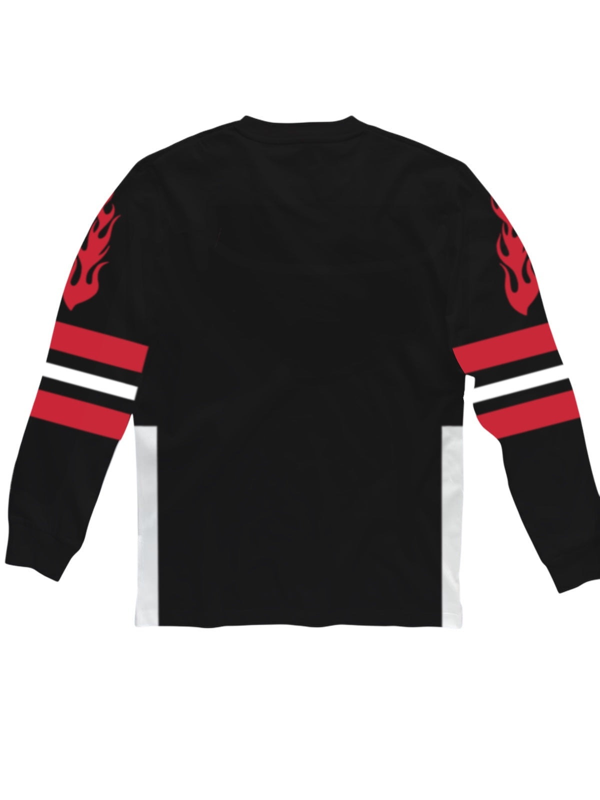 • Design Elements: Bold number print, flame motifs on sleeves, contrasting stripes