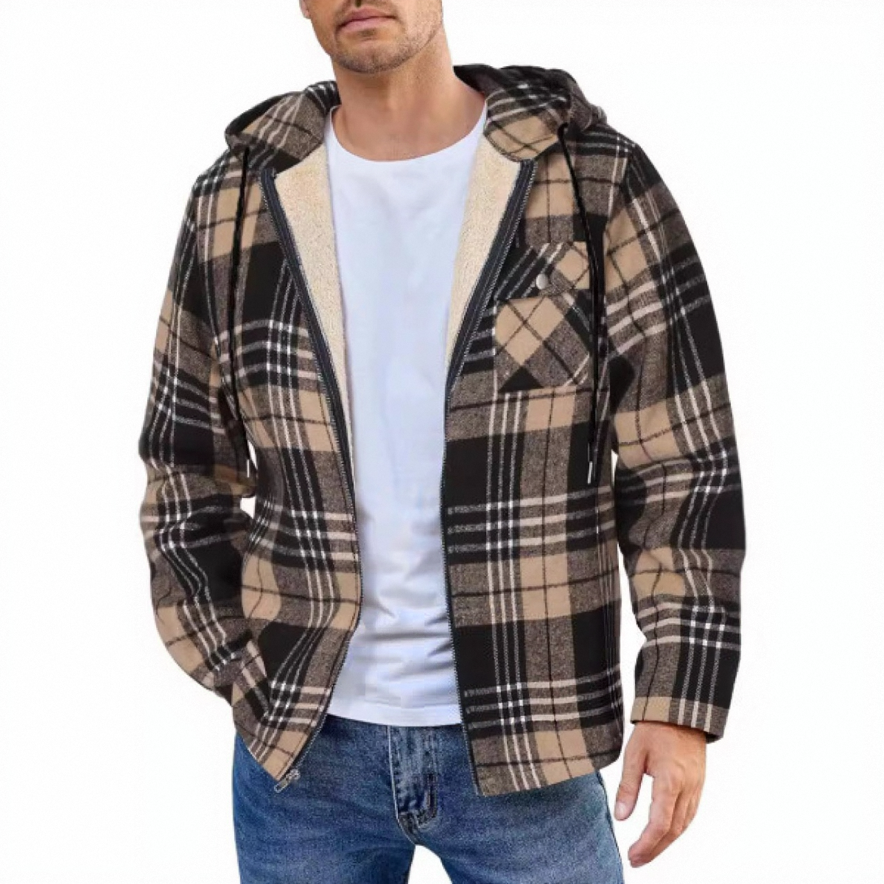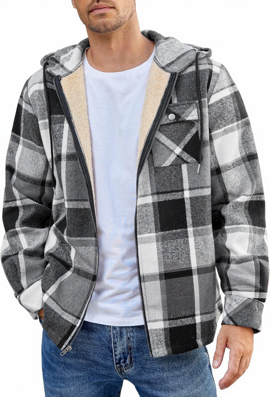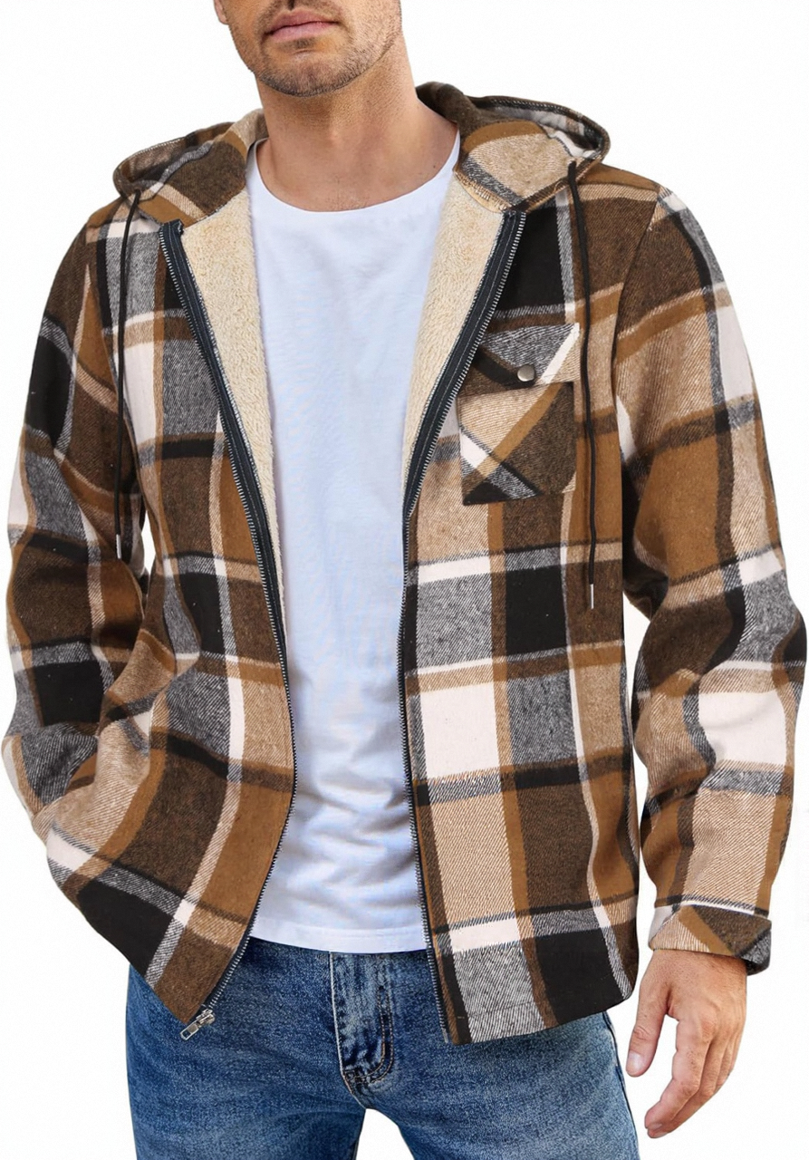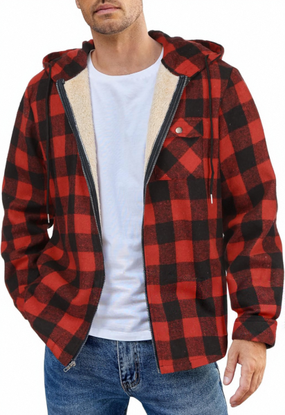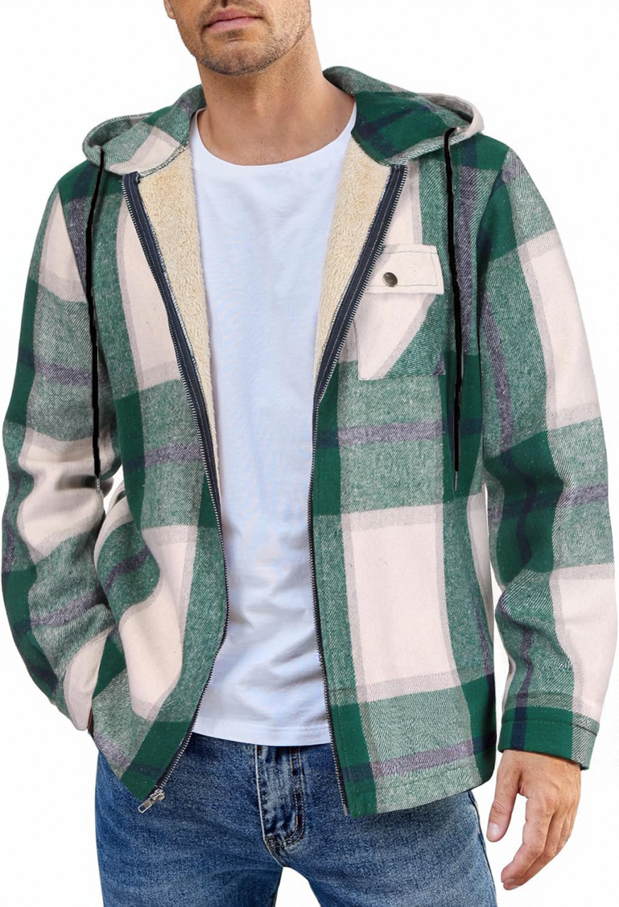 • Design Elements: Plaid pattern, hooded design, front zipper closure
