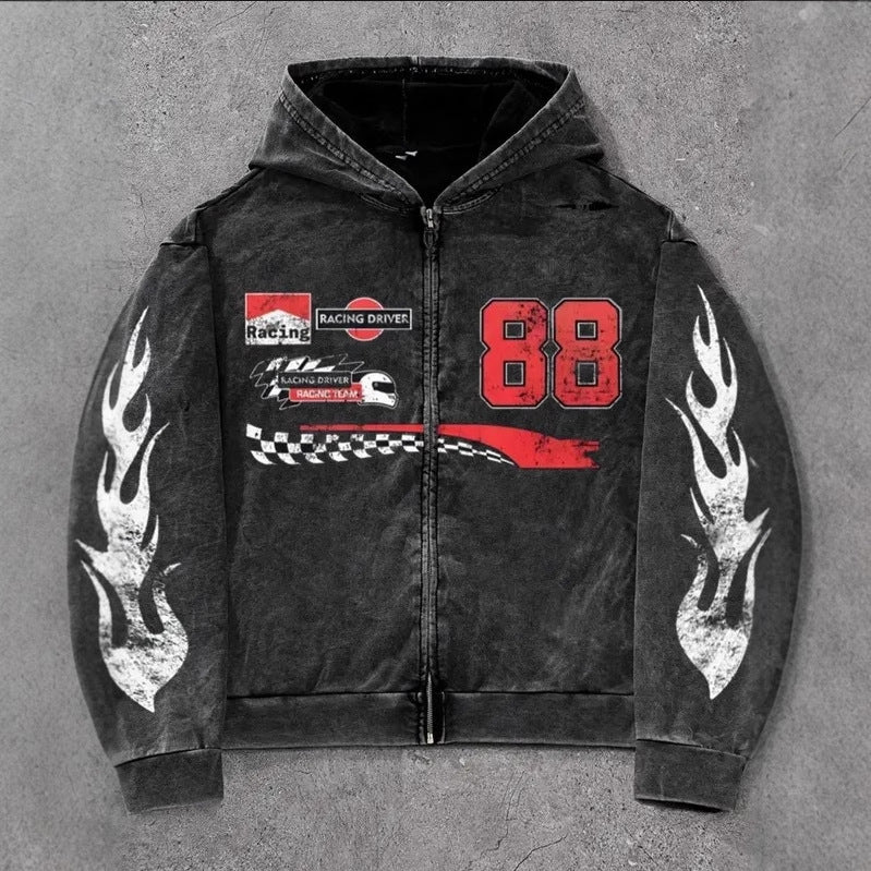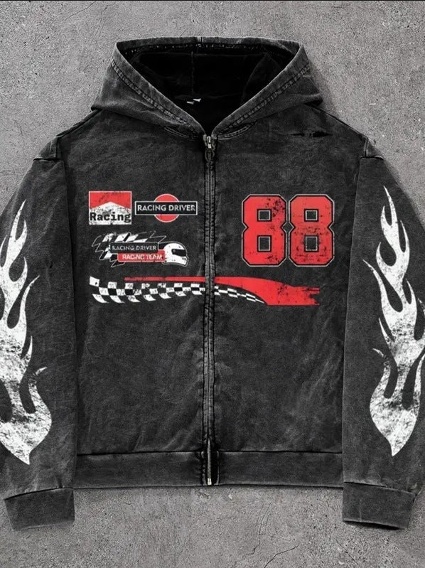 • Design Elements: Bold flame graphics on sleeves, racing-themed patches, prominent number "88" design