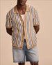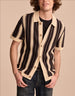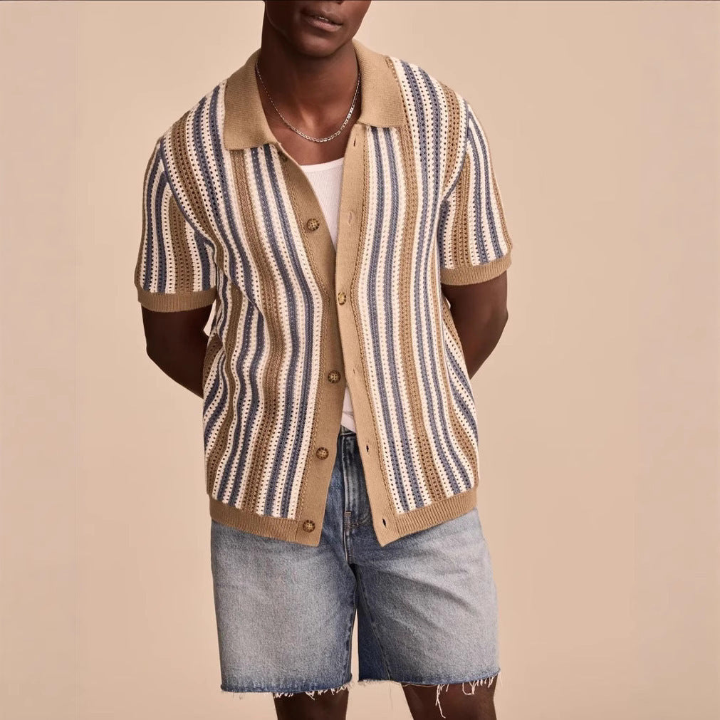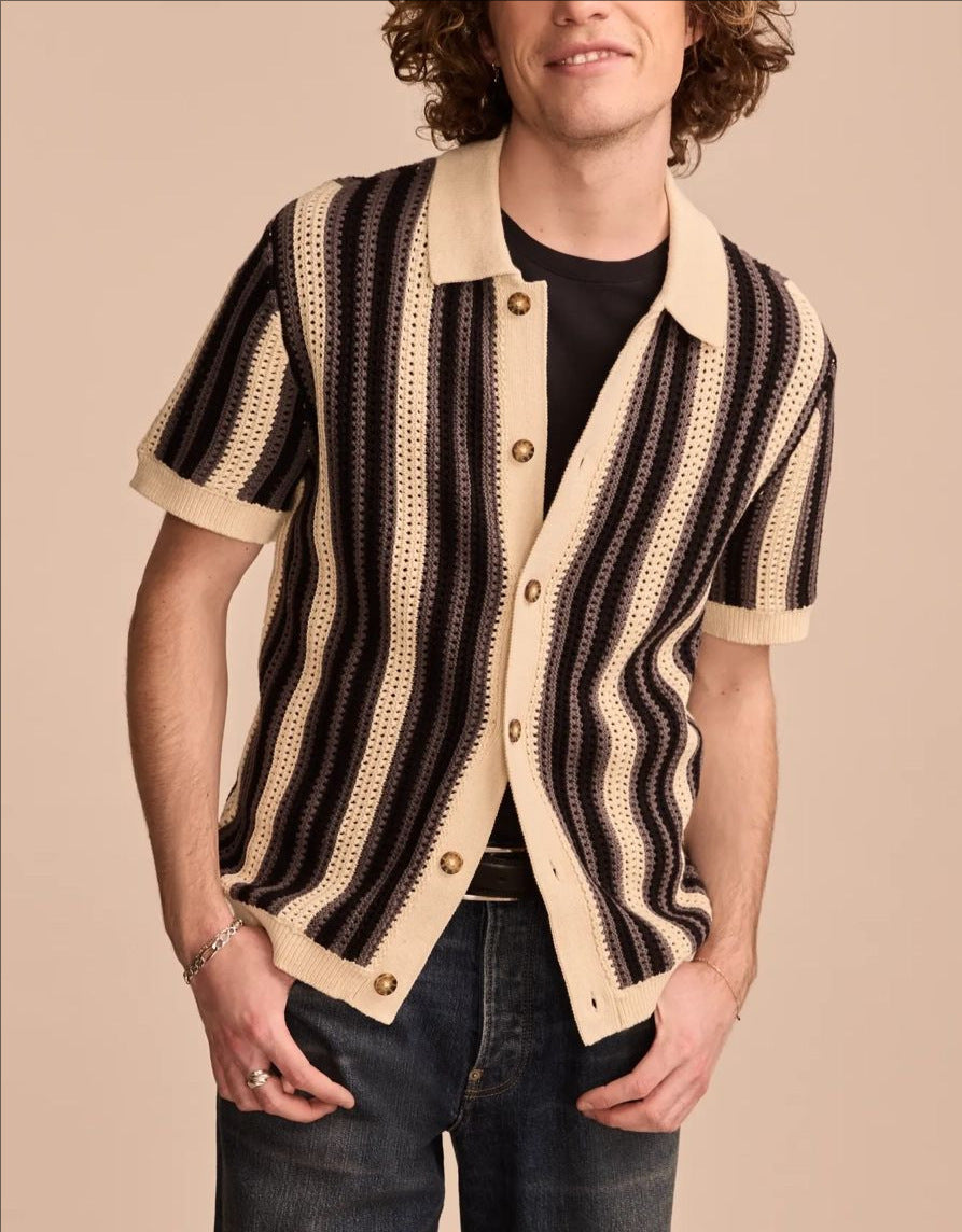 • Design Elements: Vertical striped pattern, button front closure, short sleeves