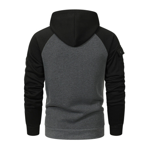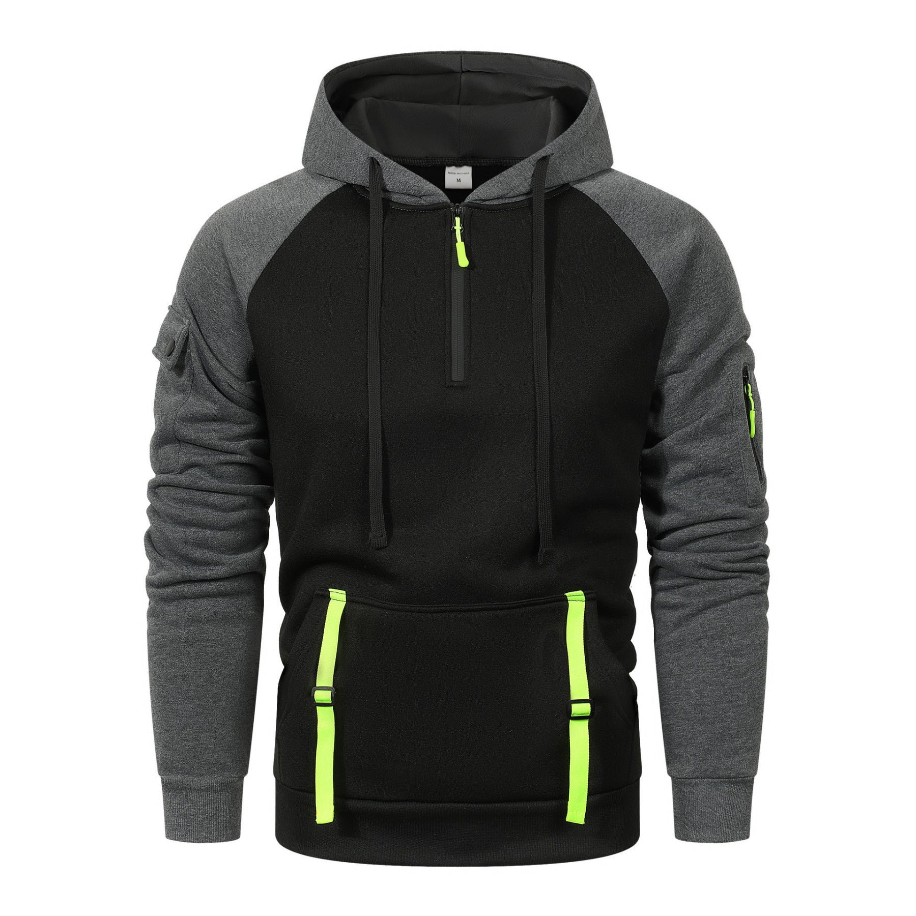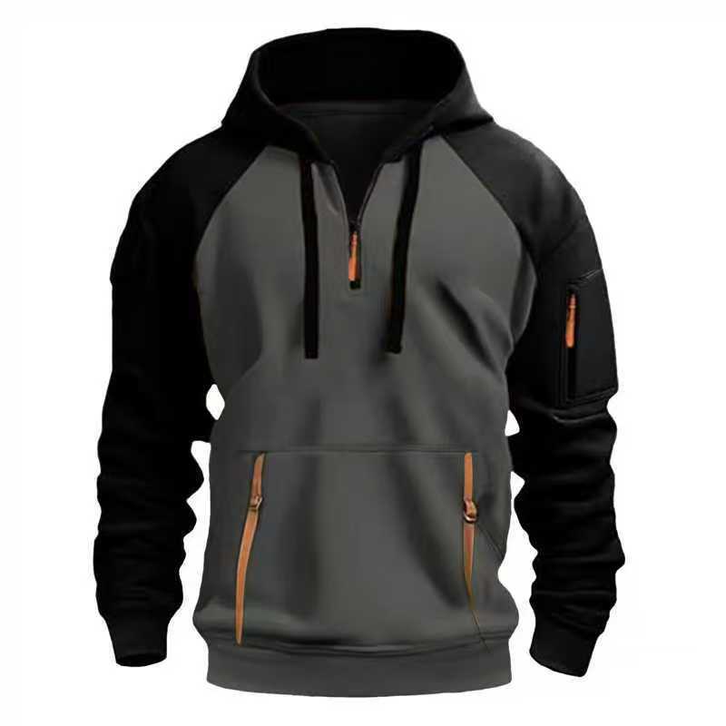 • Design Elements: Contrasting black sleeves and beige body, orange zipper accents, zippered arm pocket