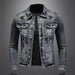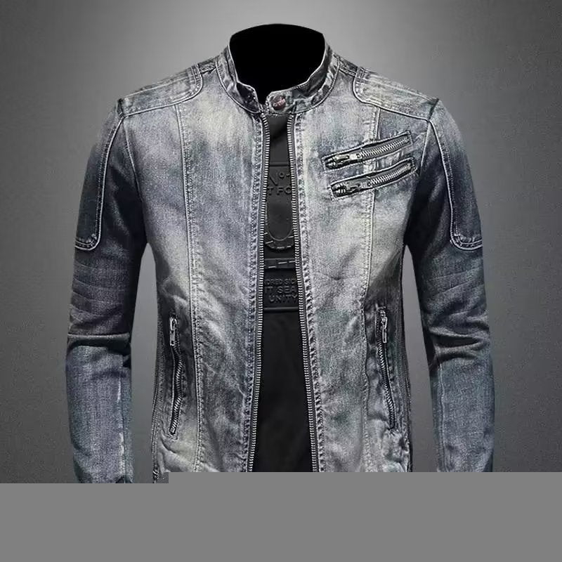 • Design Elements: Zippered pockets, distressed look, stand-up collar