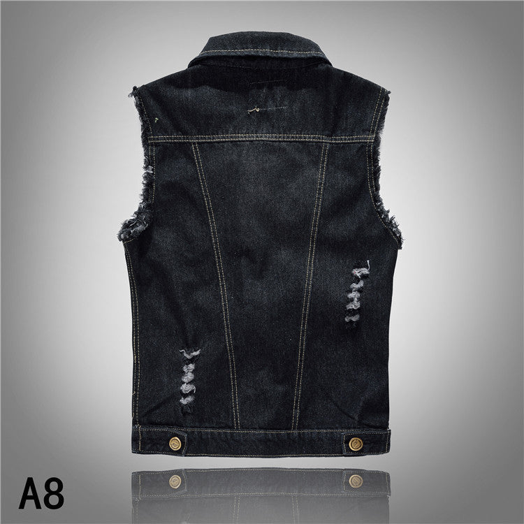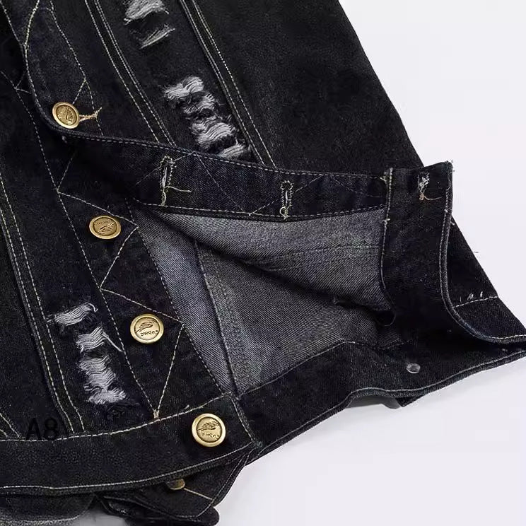 • Design Elements: Distressed details, button closures, and classic collar