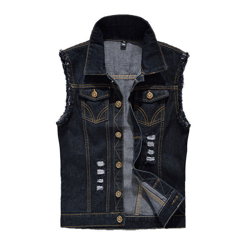 • Design Elements: Distressed details, chest pocket, sleeveless design