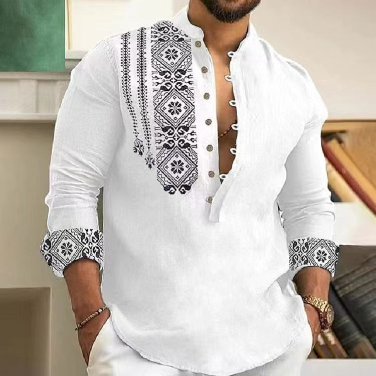 • Design Elements: Intricate geometric embroidery, button-down front, rolled-up sleeves