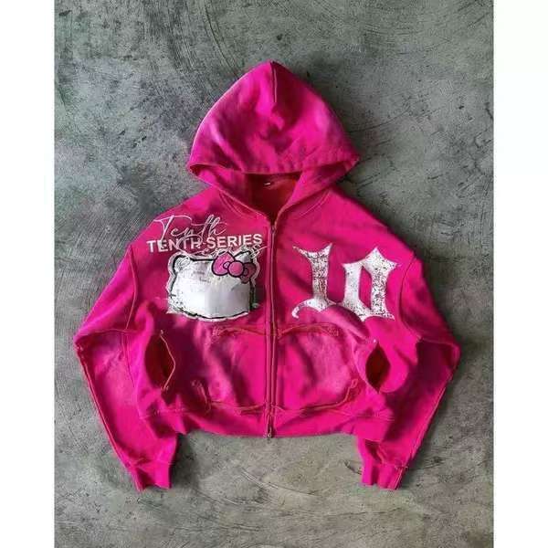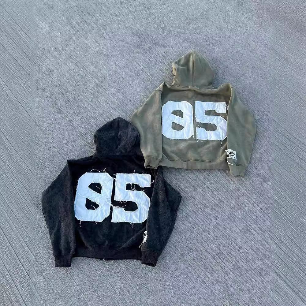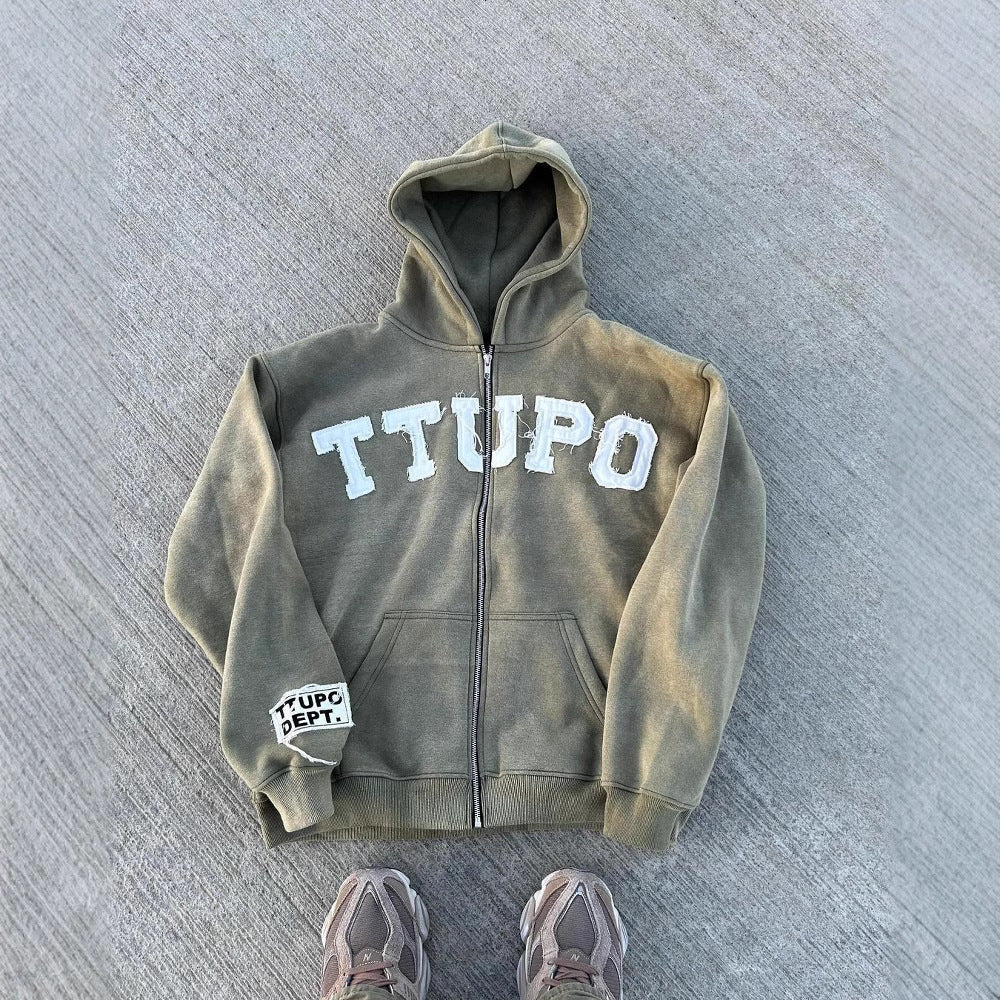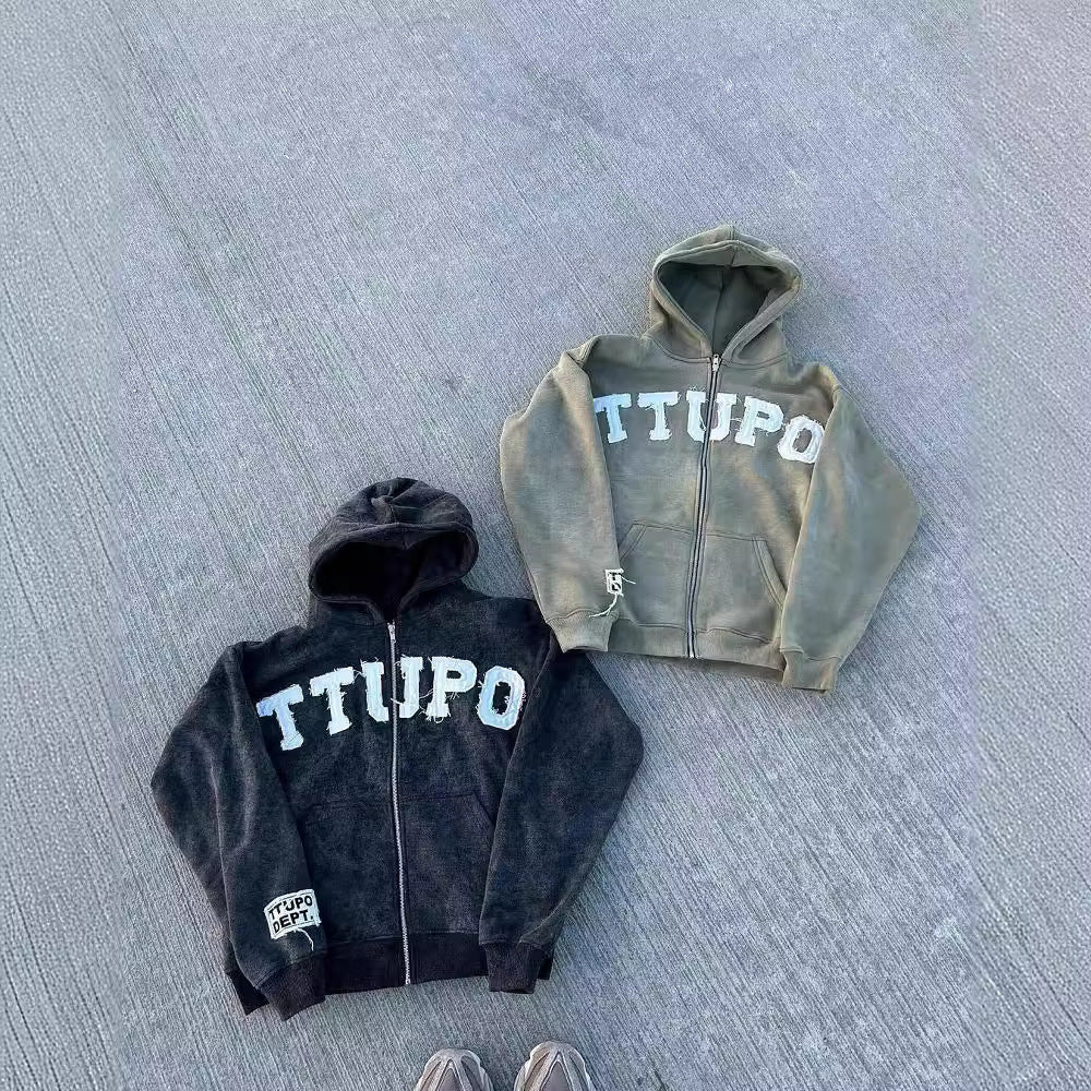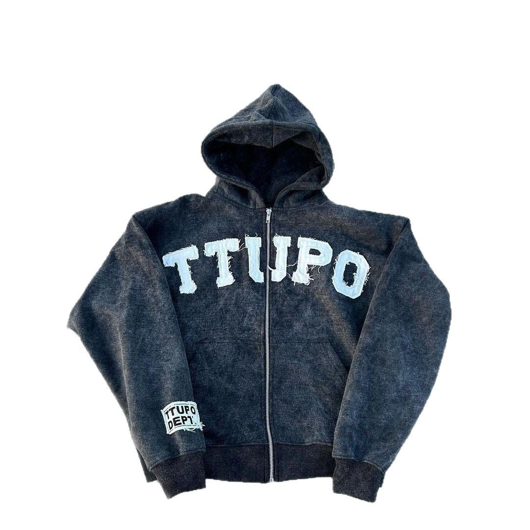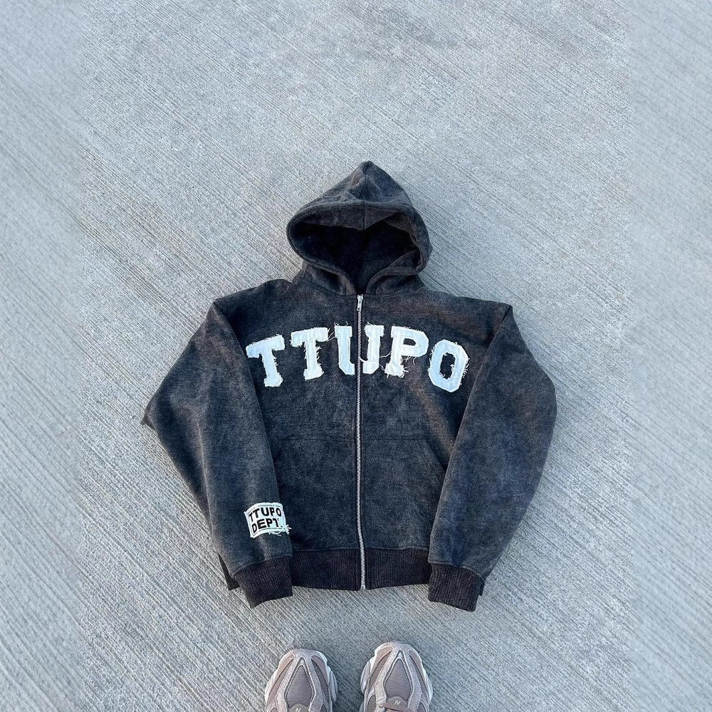 • Design Elements: Distressed look with bold lettering on the front, hood design, and zippered closure