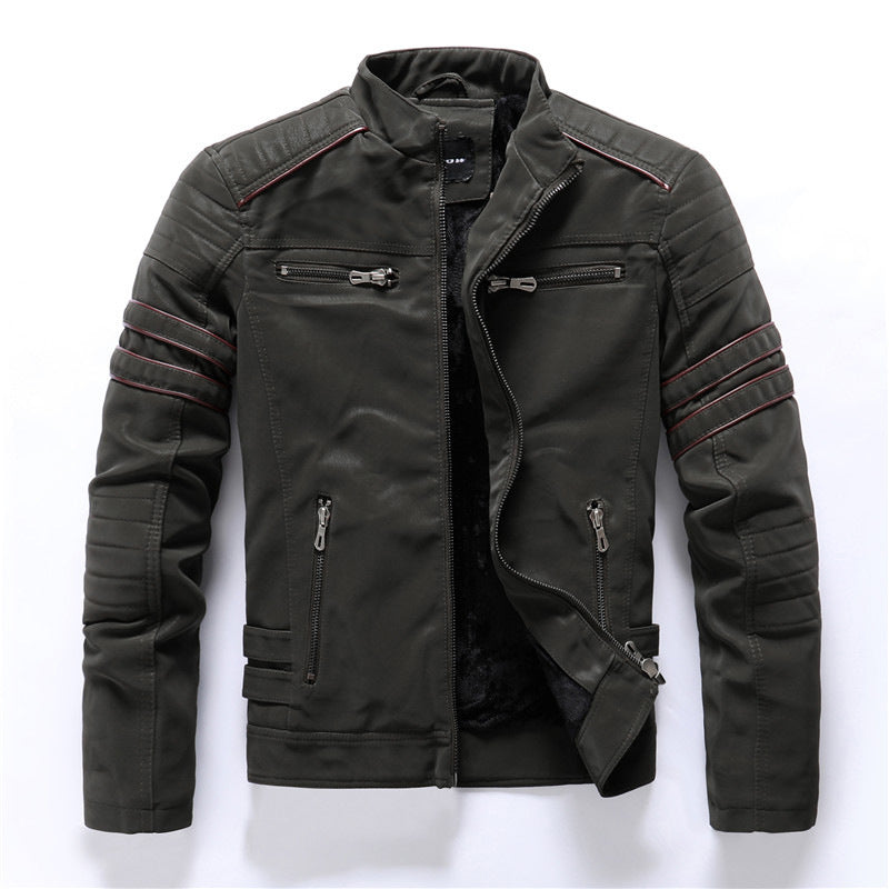 • Design Elements: Zippered arm pockets, red stitching accents, sleek biker style
