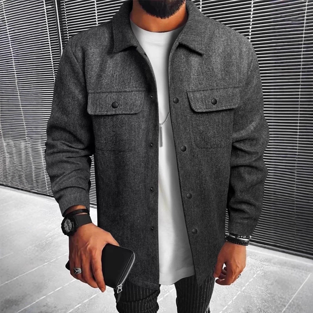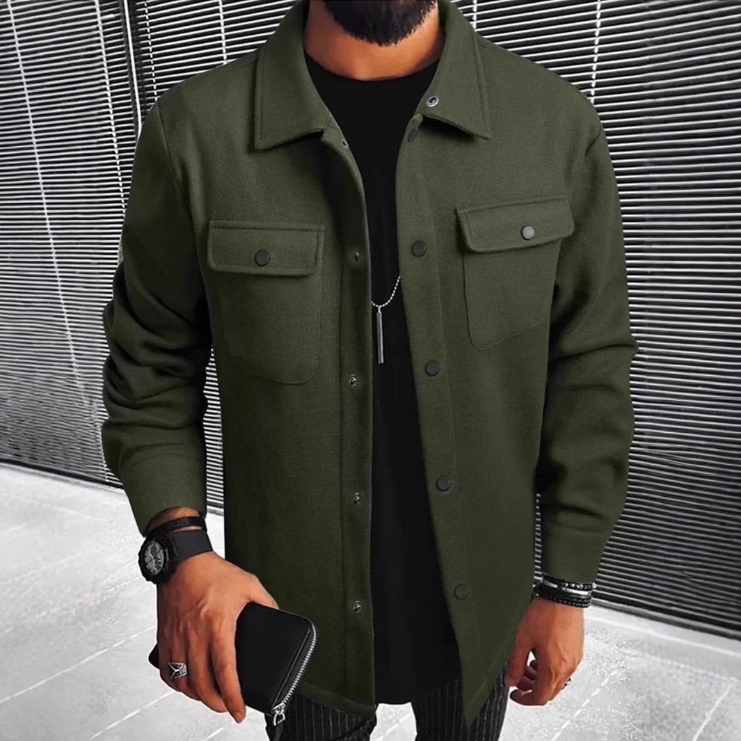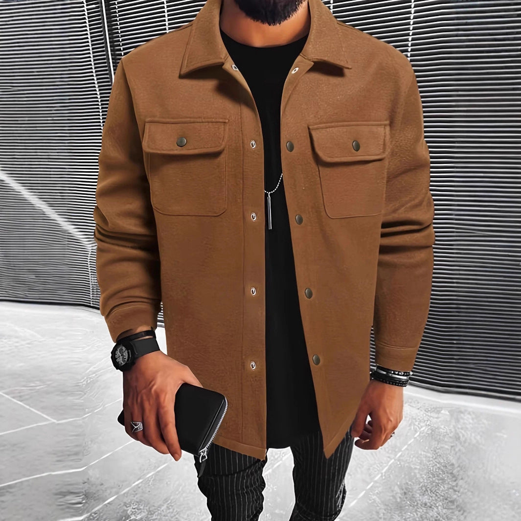 • Design Elements: Two front chest pockets with snap buttons, sleek button closure, contemporary styling