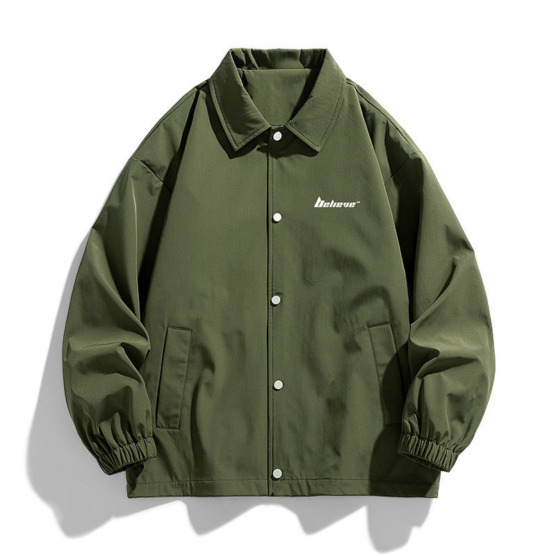 • Design Elements: Embroidered text on the chest, button closure, two side pockets