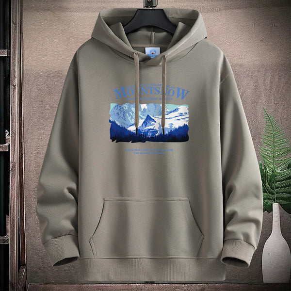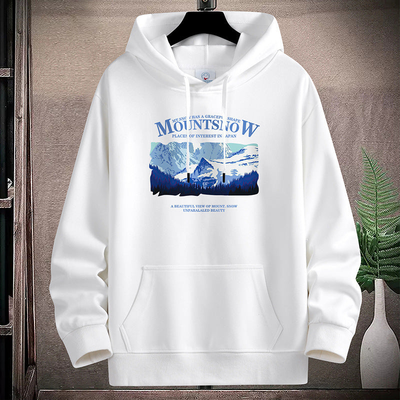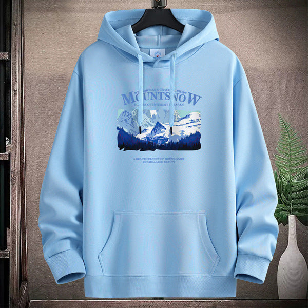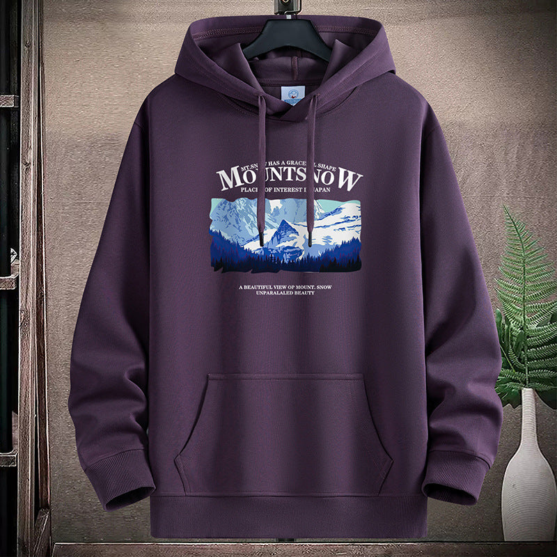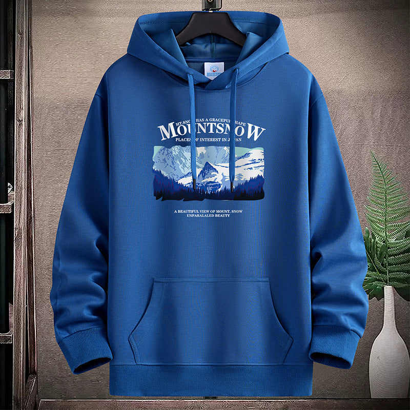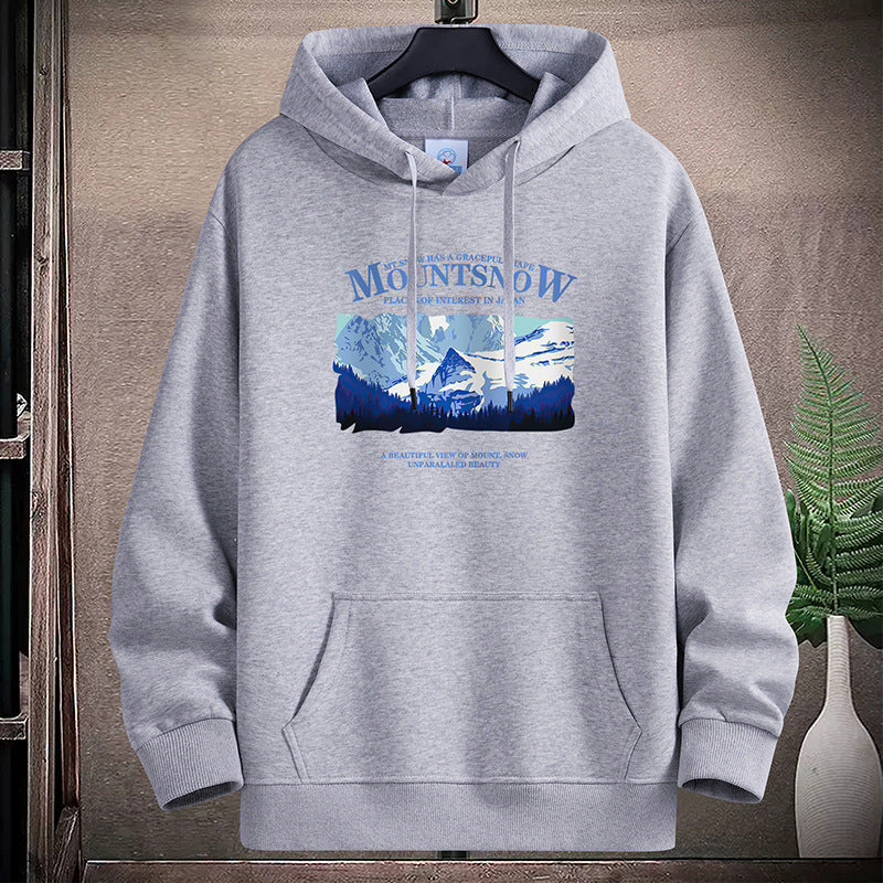 • Design Elements: Front pocket, mountain graphic print, drawstring hood