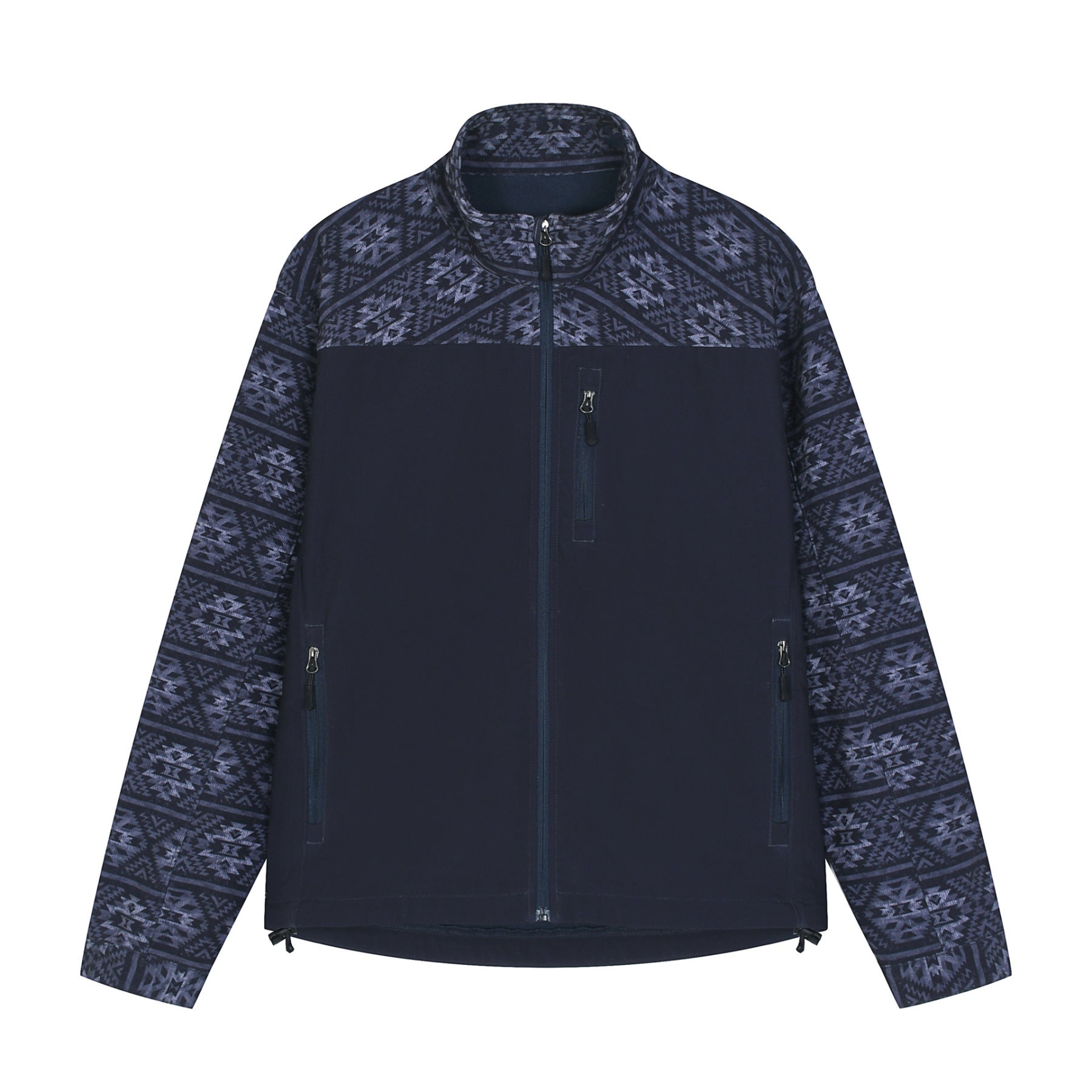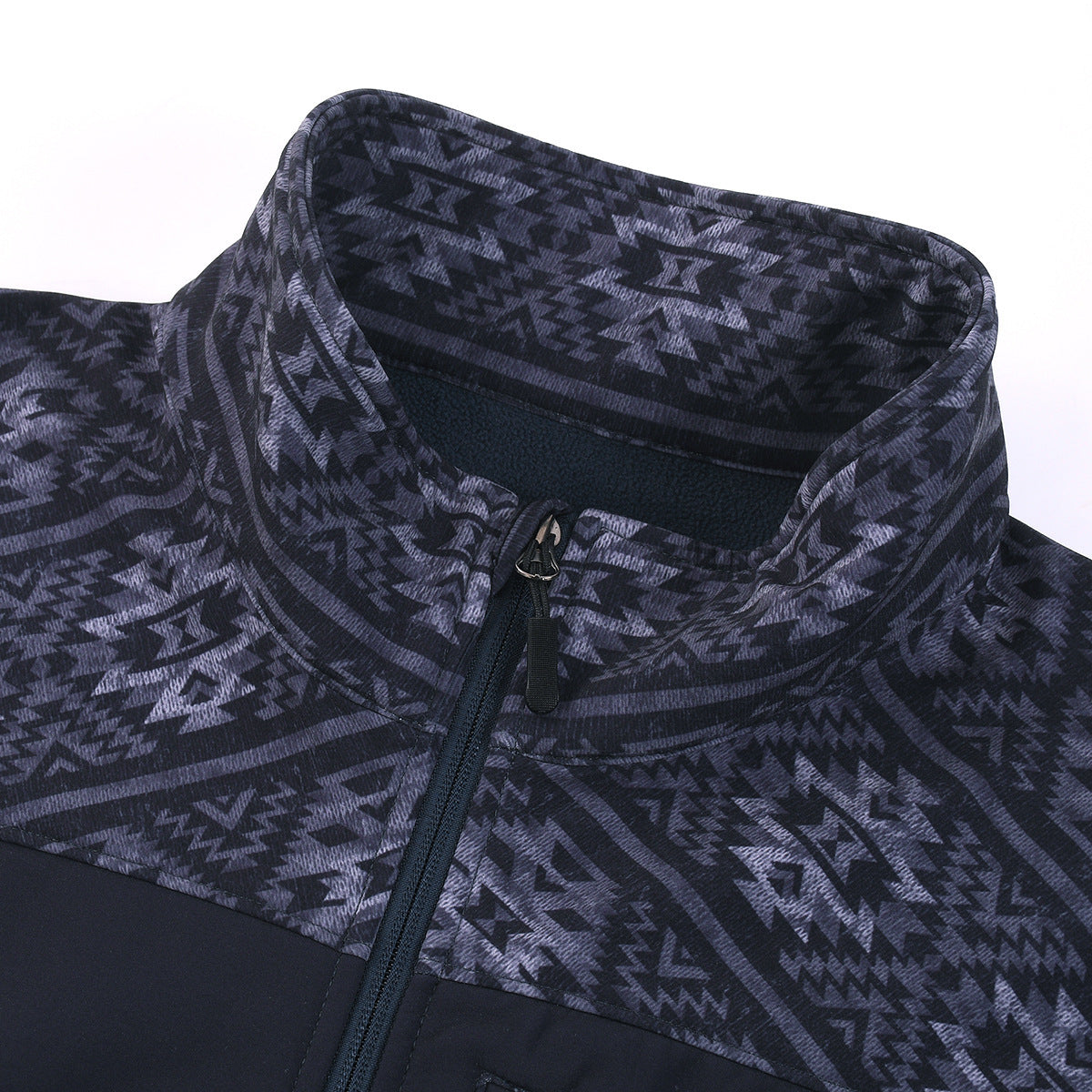 • Design Elements: Unique geometric patterns on sleeves and shoulders, sleek front zipper closure