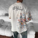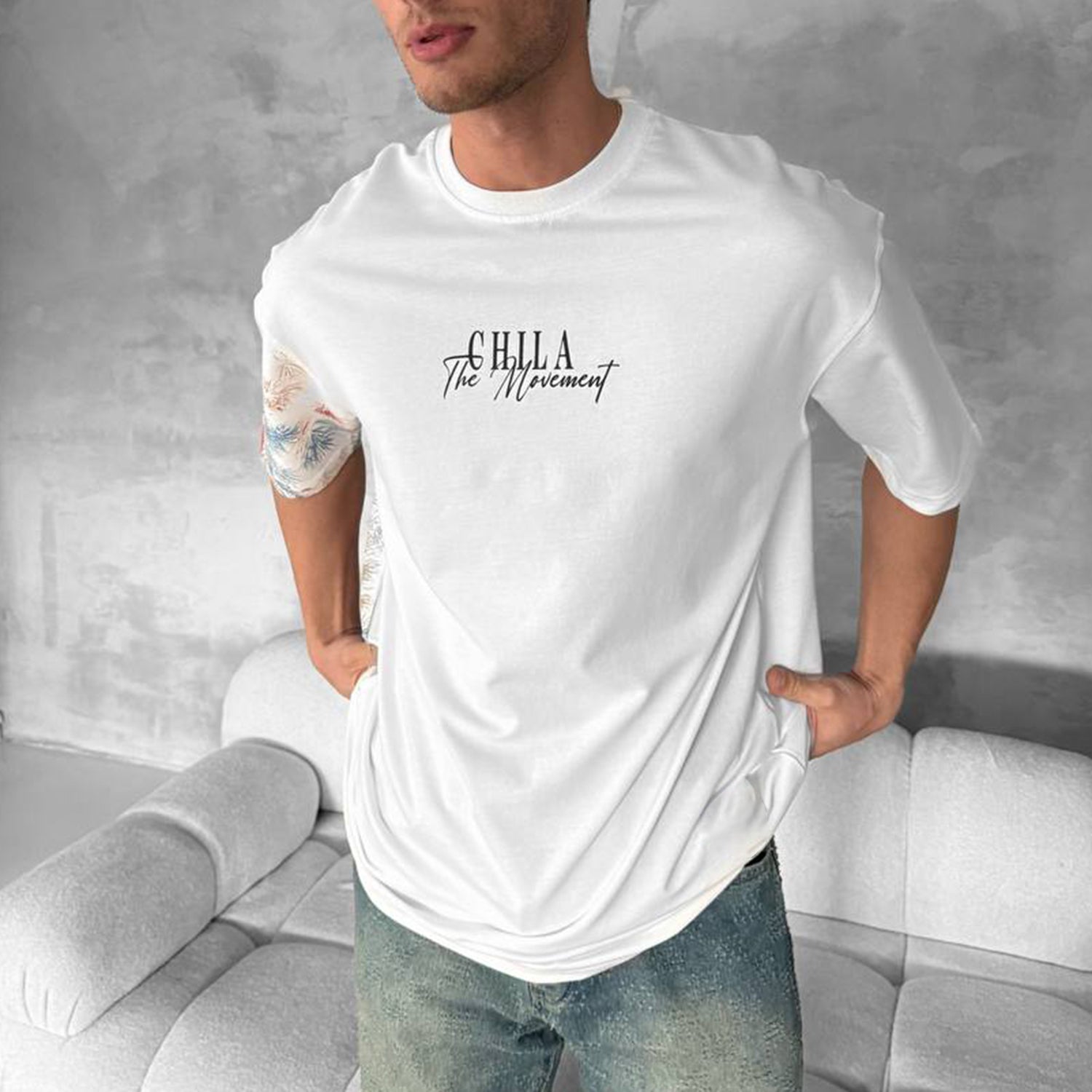 • Design Elements: Text graphic on the chest, floral pattern on one sleeve