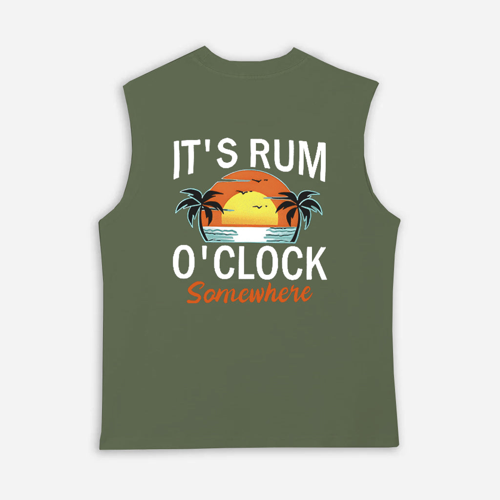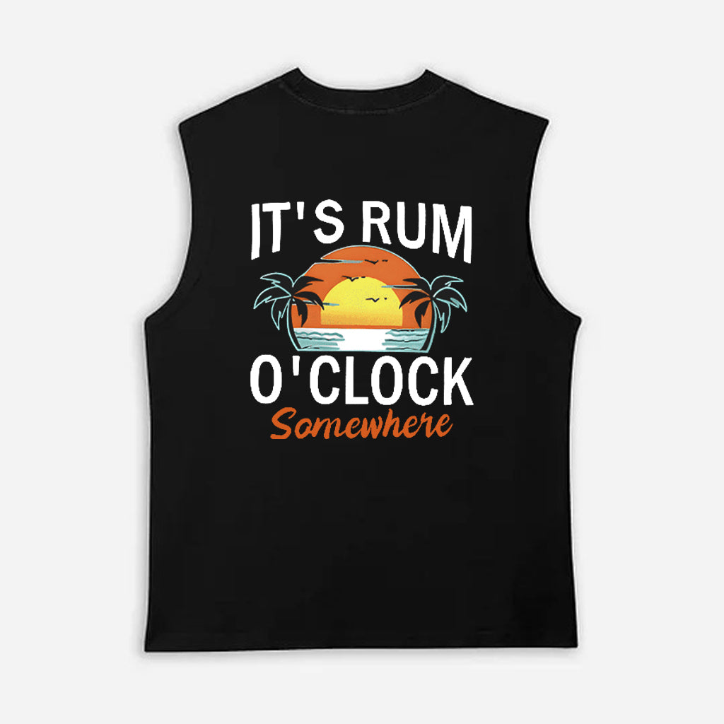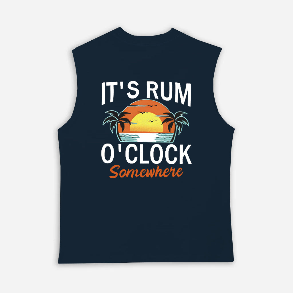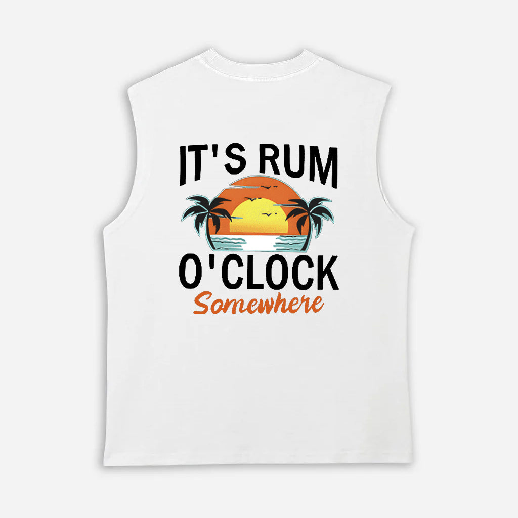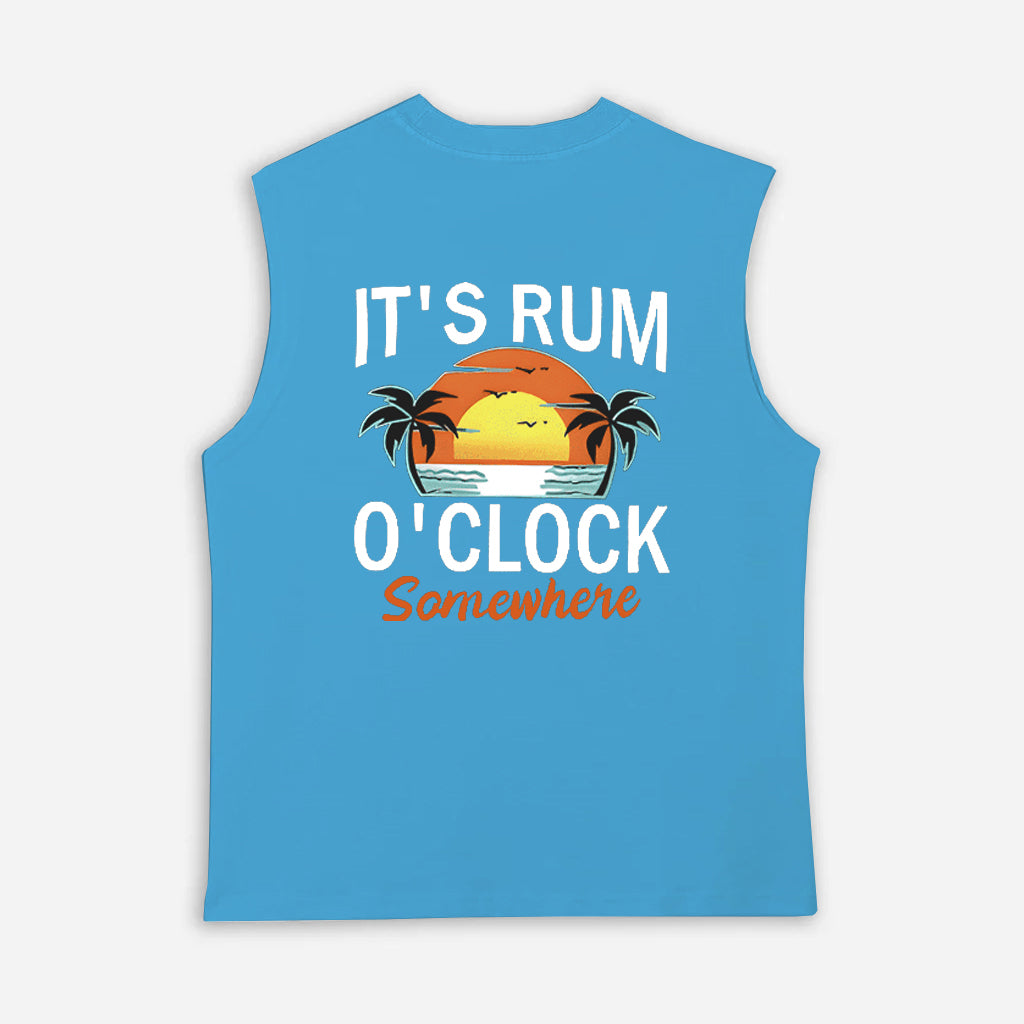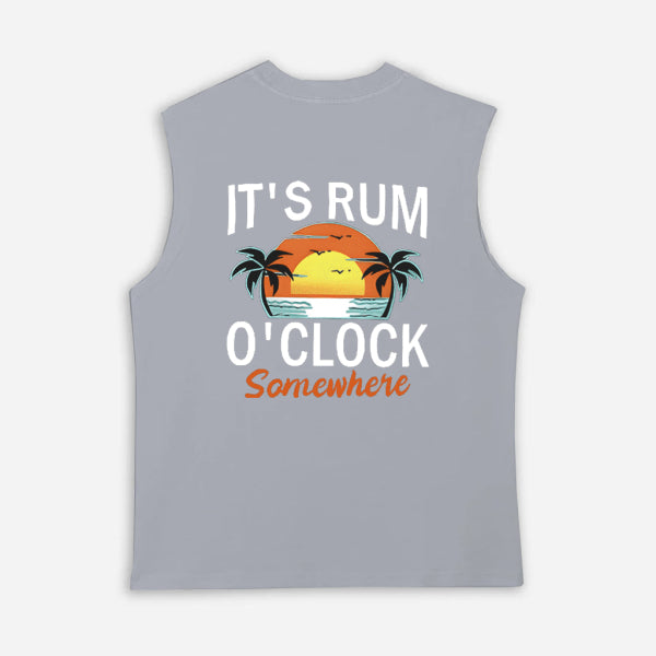 • Design Elements: Vibrant sunset graphic with palm trees and playful text