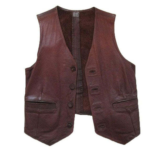 1960s-70s vintage men's chestnut brown custom leather vest, hand-crafted by Leathering Heights of Provincetown, Massachusetts. Features include front slit pockets and four leather buttons. Very good to excellent condition: no major flaws, just authentic distress from wear.